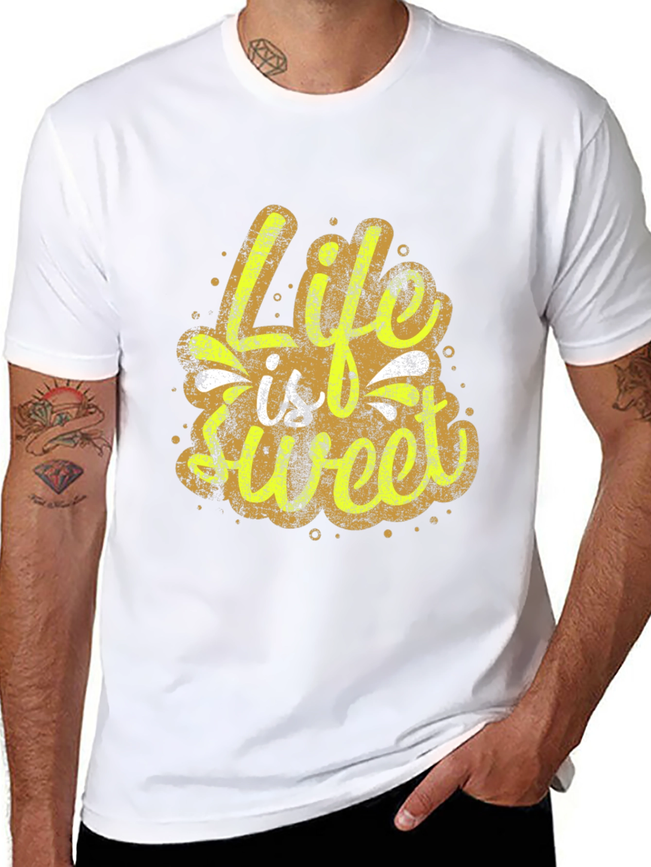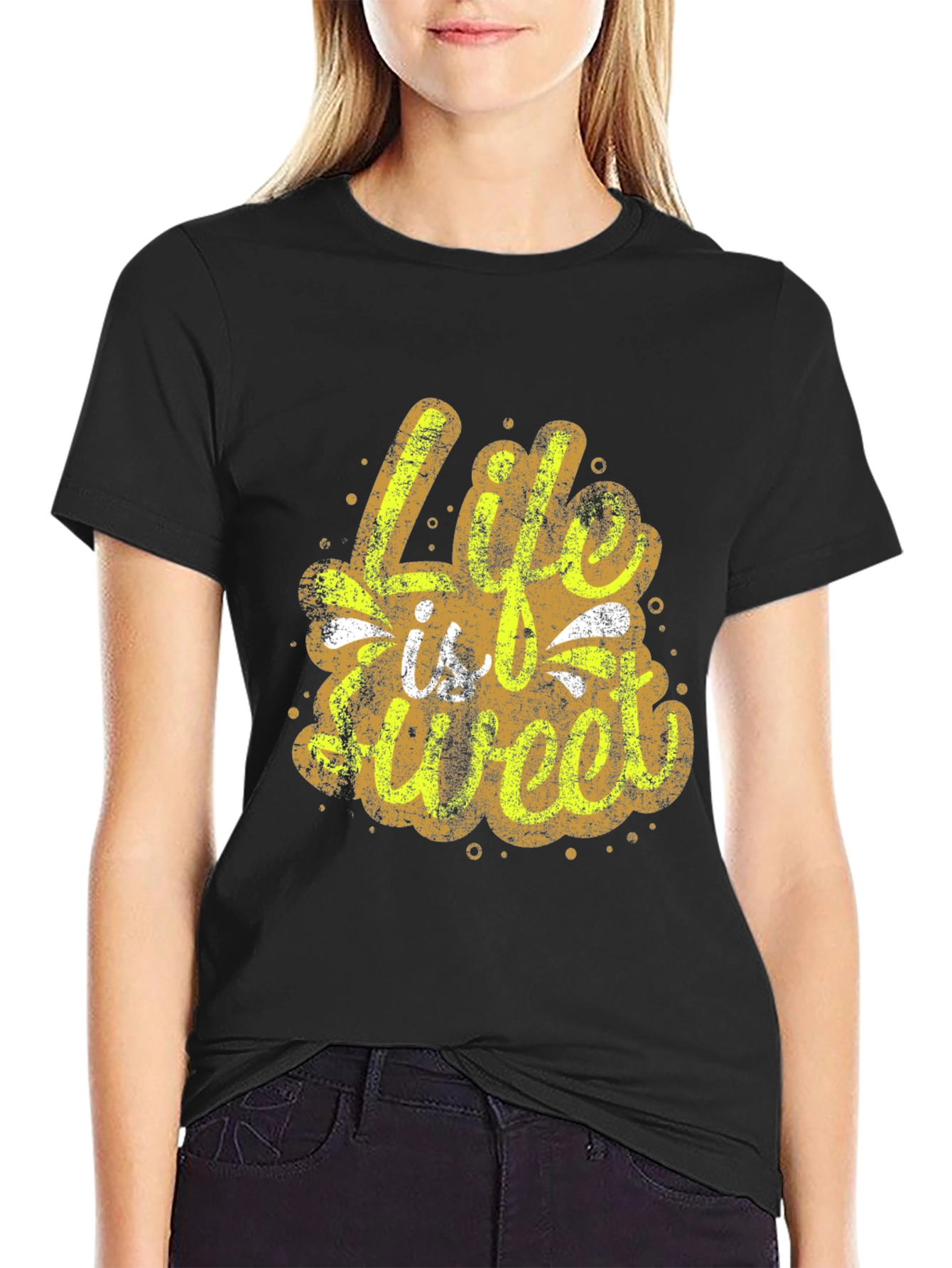 This stylish black t-shirt features a unique, distressed graphic print that reads 'Life is Sweet'. The design combines a retro feel with a modern aesthetic, perfect for casual wear. Crafted from comfortable, breathable fabric, this t-shirt offers a relaxed fit, making it ideal for everyday activities. The vibrant design adds a pop of personality to any outfit, and makes a statement wherever you go. Pair it with jeans or shorts for a cool, effortless look. Express yourself with this eye-catching and comfortable tee!