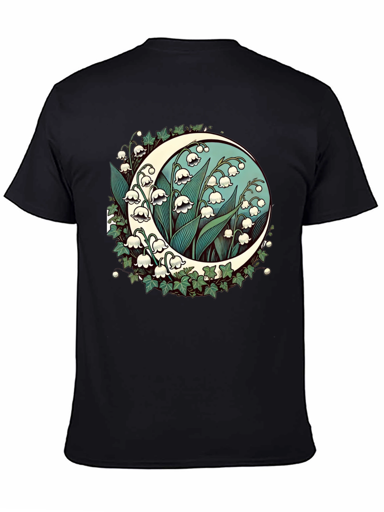 Embrace the enchanting allure of nature with this eye-catching graphic tee. The design features a crescent moon cradling a serene arrangement of Lily of the Valley flowers. Lush leaves and delicate white blossoms create a captivating visual. Crafted from a soft, breathable fabric, this shirt ensures all-day comfort. The black background makes the graphic pop and easy to style. Perfect for adding a touch of whimsy to your everyday wardrobe or as a thoughtful gift for the nature lover in your life, this tee is a wearable work of art that effortlessly blends style and comfort.