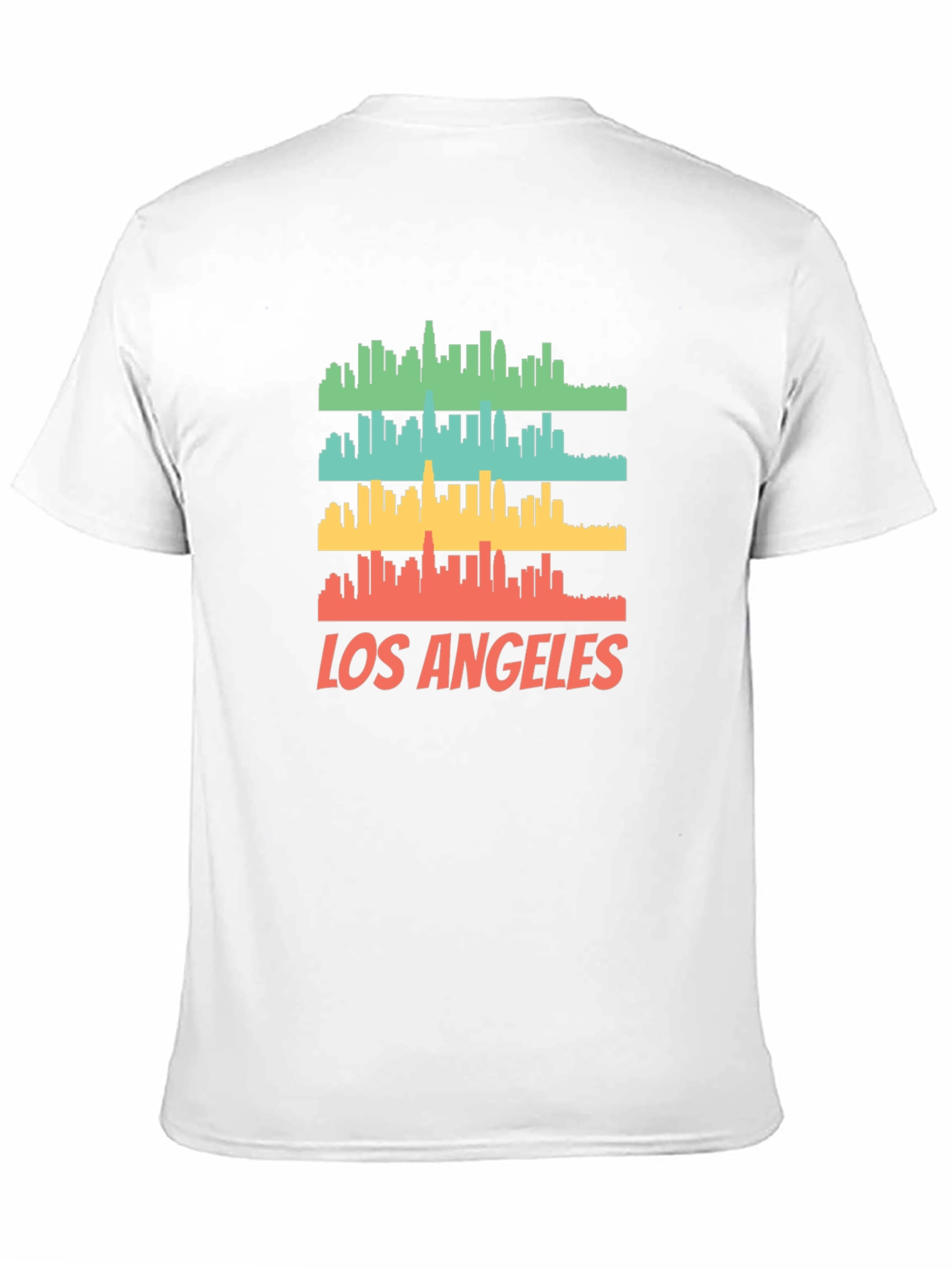 Show your love for LA with this stylish graphic t-shirt. The shirt features a multi-colored skyline design of Los Angeles, stacked in retro-inspired stripes. The design is completed with the city name printed below the skyline. Made from comfortable material, this tee is perfect for casual outings, everyday wear, or as a souvenir. The classic crew neck and short sleeves make it a versatile addition to any wardrobe. Get yours today and represent the City of Angels in style!