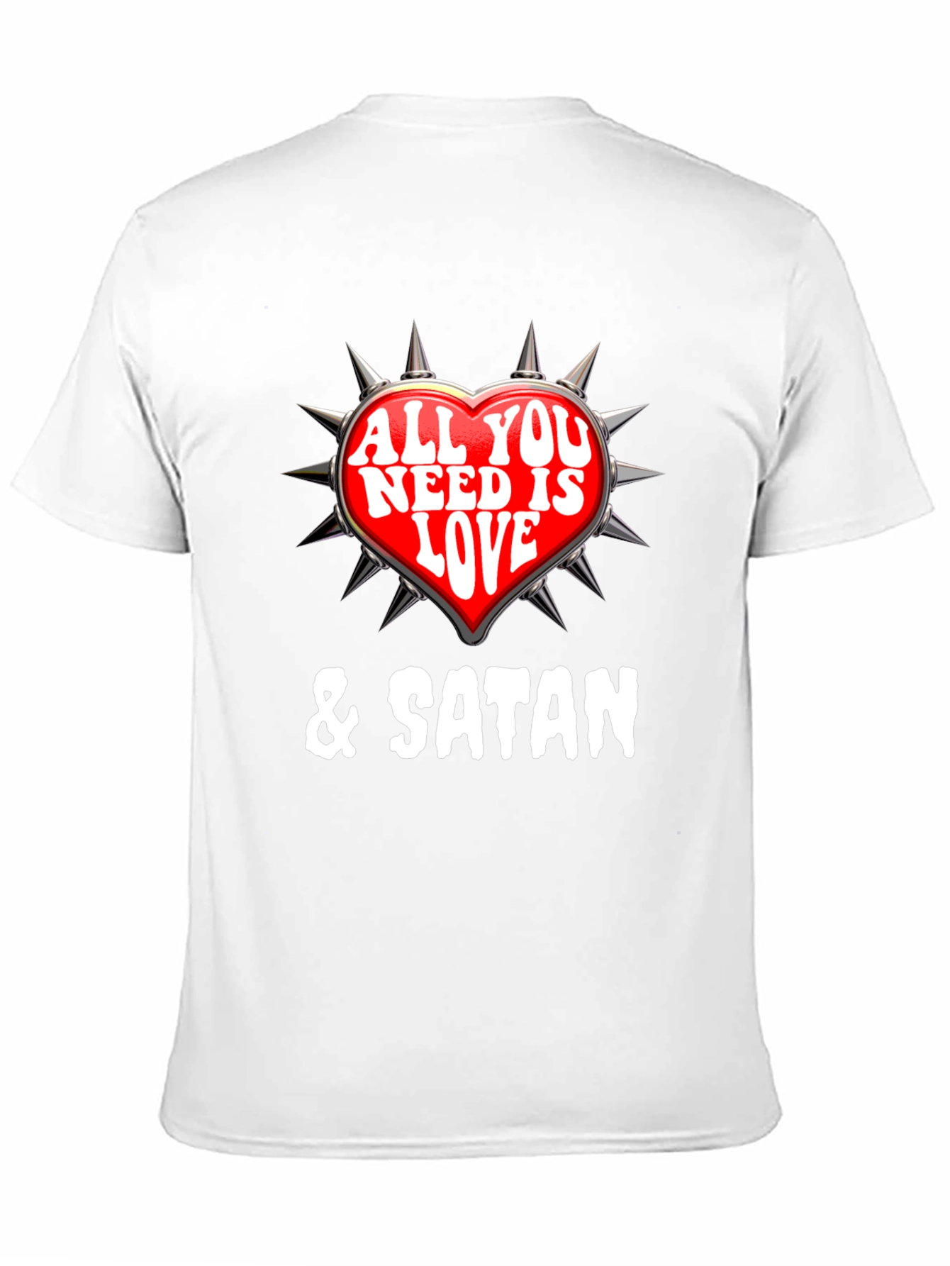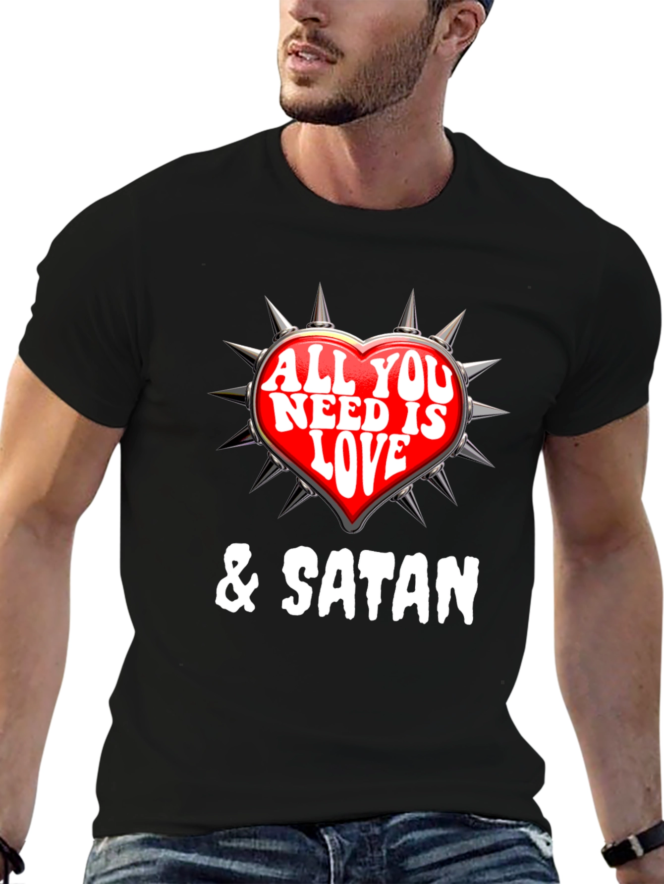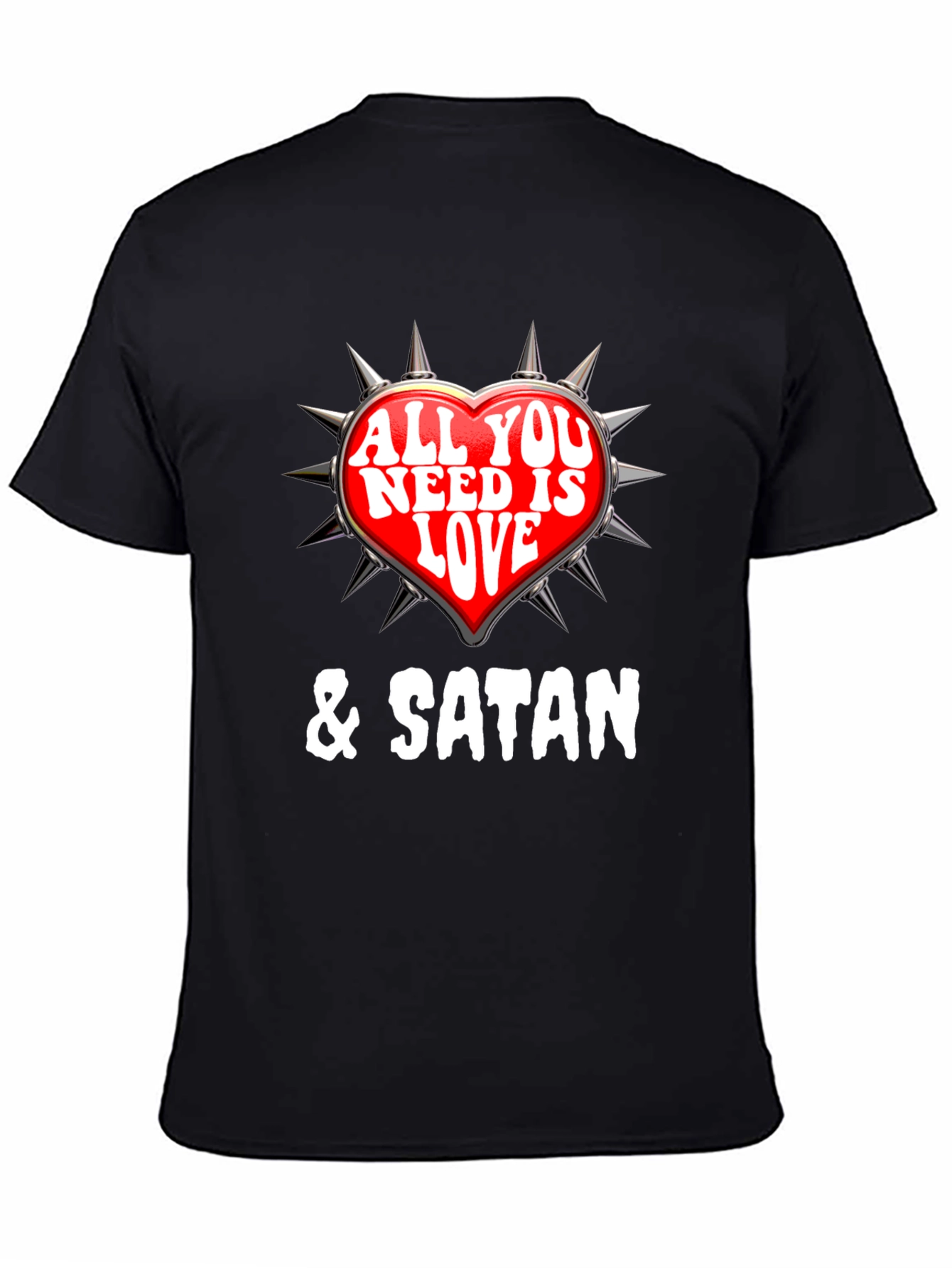 Show off your edgy side with this unique black t-shirt. The design features a vibrant red heart encircled by metal spikes, proclaiming "All You Need is Love" above the provocative phrase "& Satan" in bold white lettering. Made from a soft, comfortable material, this shirt is perfect for casual wear, concerts, or making a statement. Embrace your inner rebel and add this eye-catching tee to your wardrobe. It’s sure to turn heads and spark conversations wherever you go. Great for those who love alternative fashion.