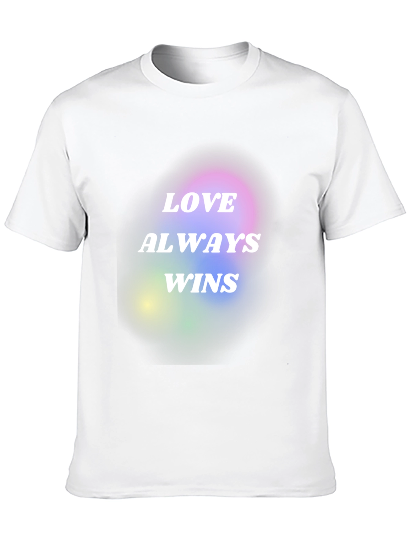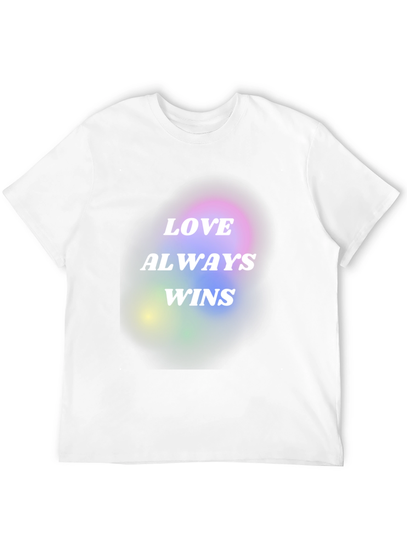 Show your support with this vibrant black t-shirt. This stylish tee features the inspiring message 'Love Always Wins' emblazoned across the chest in a soft, glowing font with pastel accents. The classic crew neck design offers a comfortable and flattering fit for everyday wear. Made from a soft-looking fabric, this shirt is perfect for casual outings, pride events, or simply spreading a message of positivity. Pair it with jeans or shorts for a relaxed look that makes a statement. Let your wardrobe reflect your values with this eye-catching and meaningful t-shirt.