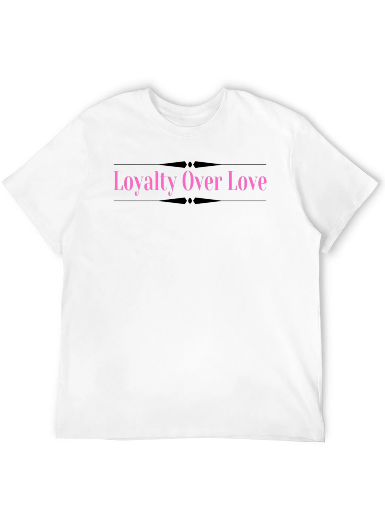 Showcase your values with this stylish black t-shirt. This unique tee features the bold statement "Loyalty Over Love" in a striking pink font, framed by elegant black accents. Made from what appears to be a comfortable and durable cotton blend, this shirt offers a relaxed fit that's perfect for everyday wear. The eye-catching graphic makes it a standout piece, ideal for casual outings, social events, or expressing your individuality. Pair it with jeans or shorts for a cool, confident look. Express yourself!