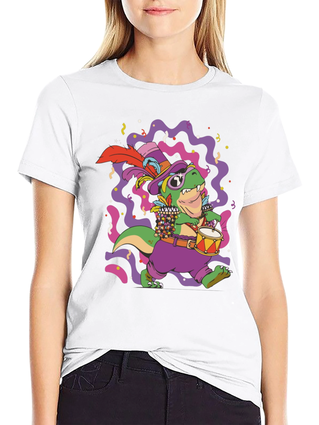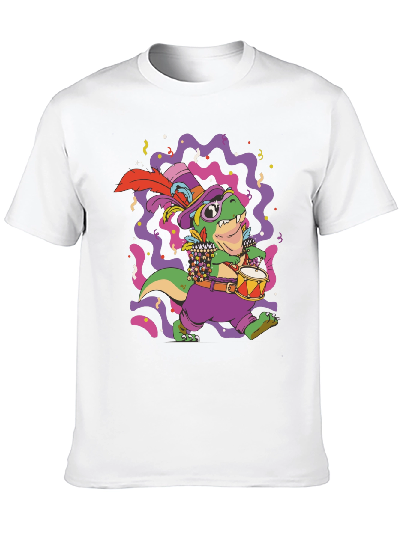 Celebrate Mardi Gras in style with this unique graphic tee! The design features a vibrant cartoon dinosaur dressed in festive Mardi Gras attire, complete with a hat, beads, and drum. The colorful design with confetti adds a playful touch to the classic black t-shirt. This shirt is perfect for parties, parades, or casual wear during the Mardi Gras season. Stand out from the crowd and show your festive spirit with this fun and eye-catching tee. Get yours now and let the good times roll!