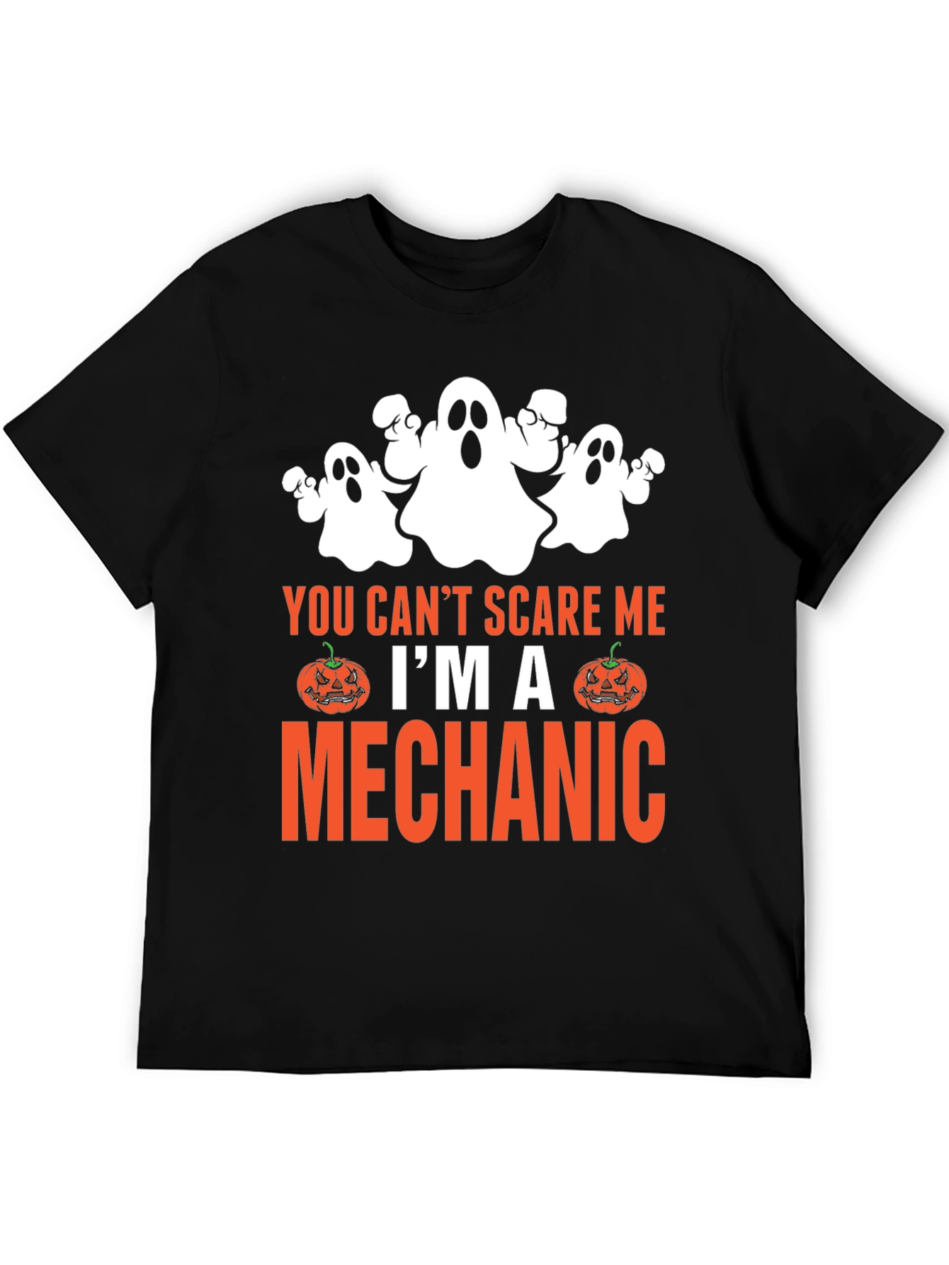 Get ready for Halloween with this fun and spooky t-shirt! This black tee features a playful graphic of ghosts and pumpkins. It reads, "You Can't Scare Me, I'm a Mechanic," making it the perfect shirt for mechanics with a sense of humor. The design is printed in white and orange, creating a bold contrast against the black background. Made from a soft and comfortable fabric, this t-shirt is ideal for casual wear during the Halloween season or any time you want to show off your profession with a spooky twist. It's a great conversation starter and a unique addition to your wardrobe.