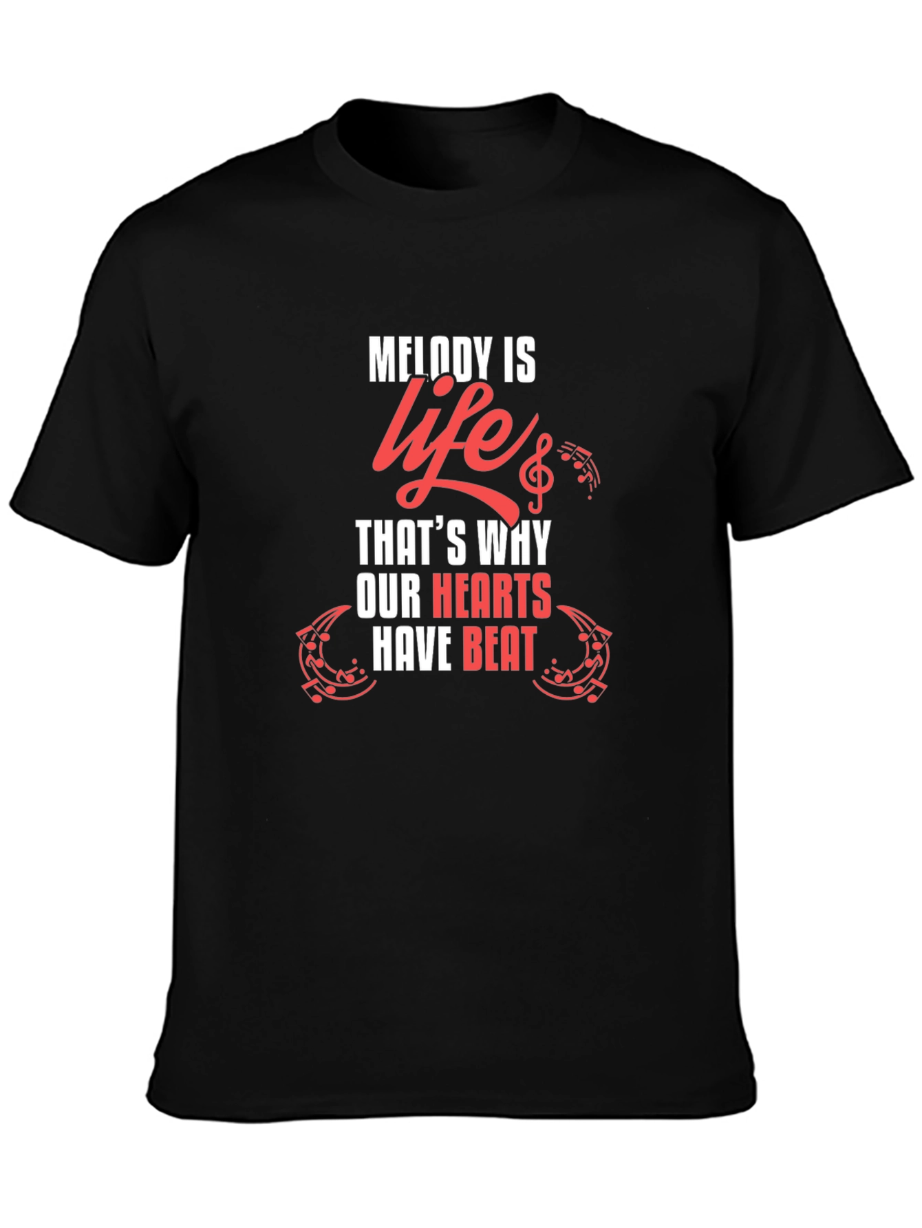 Express your love for music with this stylish black graphic tee! Featuring the phrase "Melody is life, that's why our hearts have beat," this shirt is perfect for musicians and music lovers alike. The design incorporates a musical treble clef with musical notes and guitar elements, adding a touch of artistry to the bold statement. Made from soft and comfortable materials, this tee is ideal for casual wear, concerts, band practice, or simply showing off your passion for music. Let your clothing strike a chord and celebrate the rhythm of life!