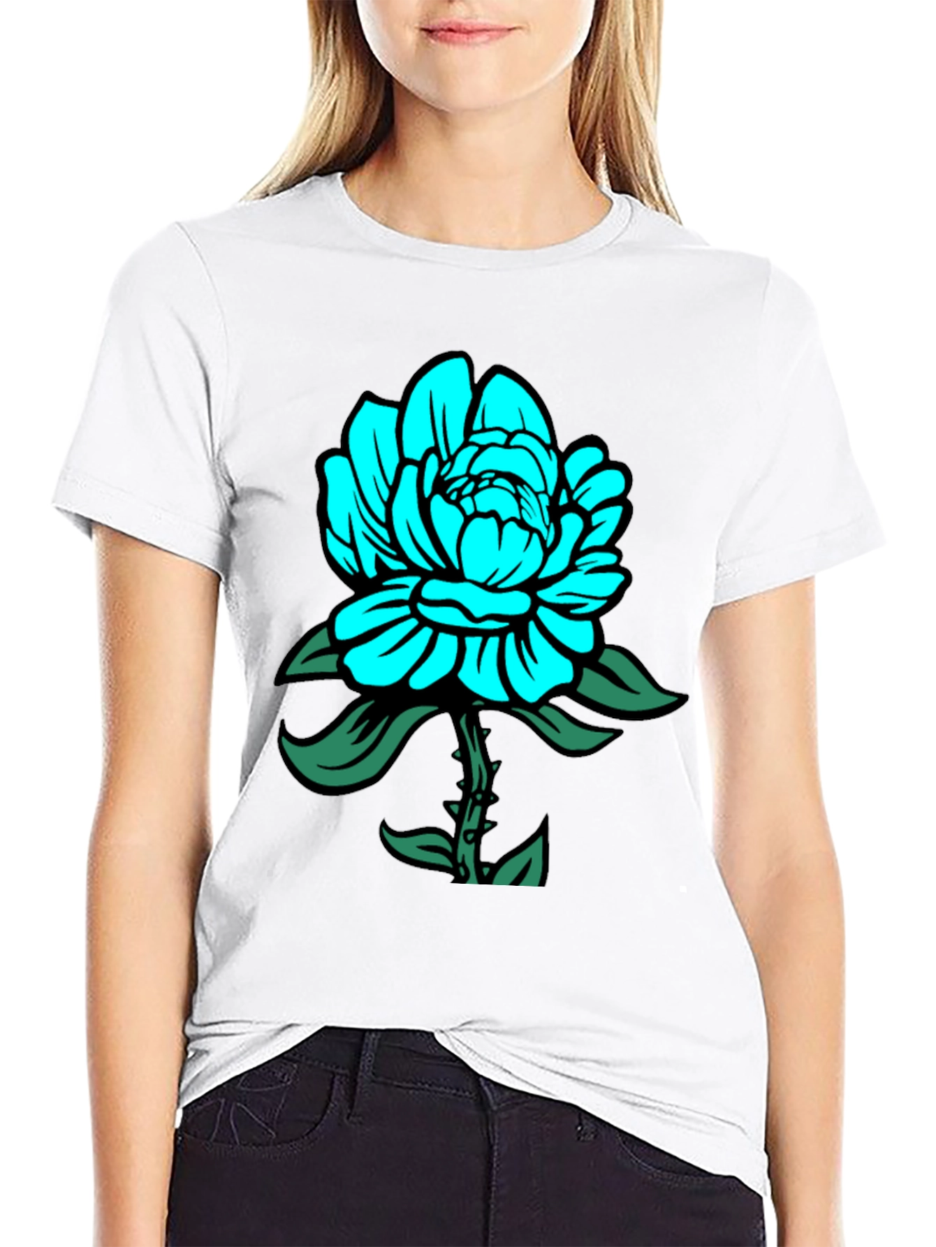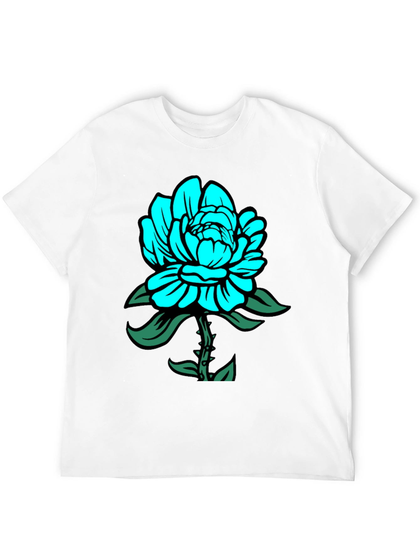 This stylish men's black t-shirt features a bold and eye-catching teal-colored floral design on the front. The design includes a detailed flower with green leaves, adding a pop of color to the classic black tee. Made from a comfortable, presumably soft fabric, this shirt is perfect for everyday wear. Its unique design makes it a great conversation starter and a standout piece in any casual wardrobe. Dress it up with jeans or keep it casual with shorts. Suitable for various occasions, this tee combines comfort and style effortlessly.