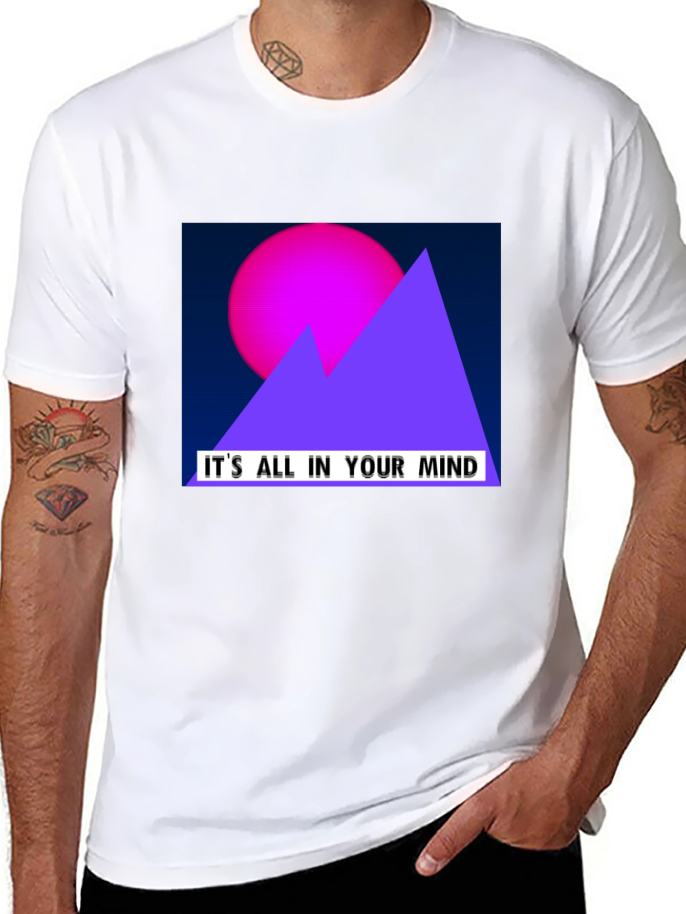 Embrace a surreal vibe with this eye-catching graphic tee. The design features a vibrant pink sun and purple mountains set against a dark background, encapsulating a dreamy landscape. Boldly emblazoned with the phrase 'IT'S ALL IN YOUR MIND', this shirt encourages introspection and imagination. Crafted from a soft, breathable fabric, this tee ensures comfort for everyday wear. Its versatile design pairs perfectly with jeans, shorts, or even layered under a jacket for a unique style. Ideal for those who appreciate unique aesthetics and thought-provoking designs, this tee is sure to spark conversations and turn heads. Add a touch of mystique to your wardrobe!