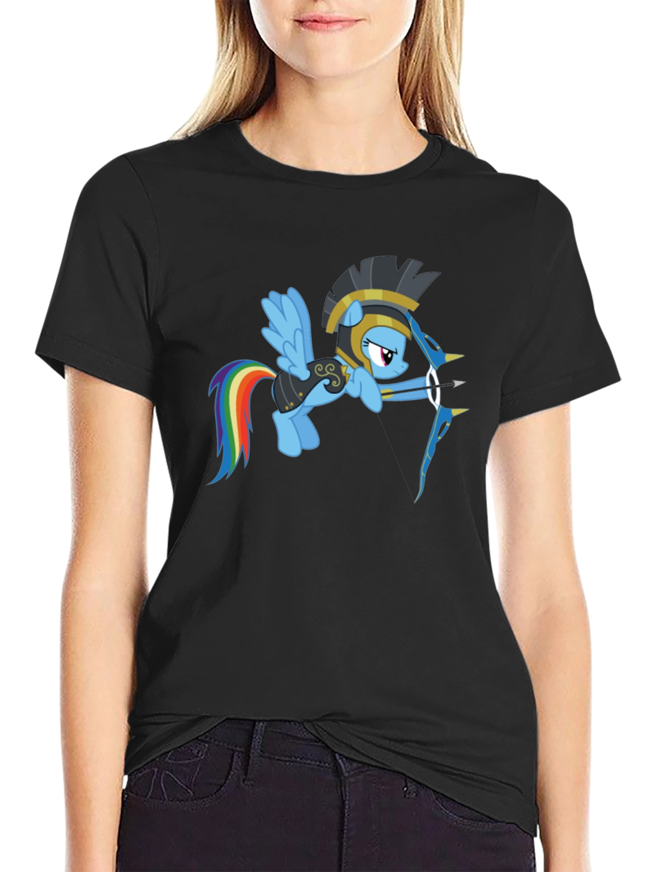 Show off your unique style with this black t-shirt featuring a vibrant graphic of Rainbow Dash as an archer! The design showcases the popular My Little Pony character with a playful warrior twist. Made from a soft, comfortable fabric, this tee is perfect for everyday wear. It's a fantastic way to express your love for the show while adding a fun, quirky touch to your wardrobe. Great for casual outings, comic conventions, or just relaxing at home. Get ready to turn heads and spark conversations with this eye-catching graphic tee!
