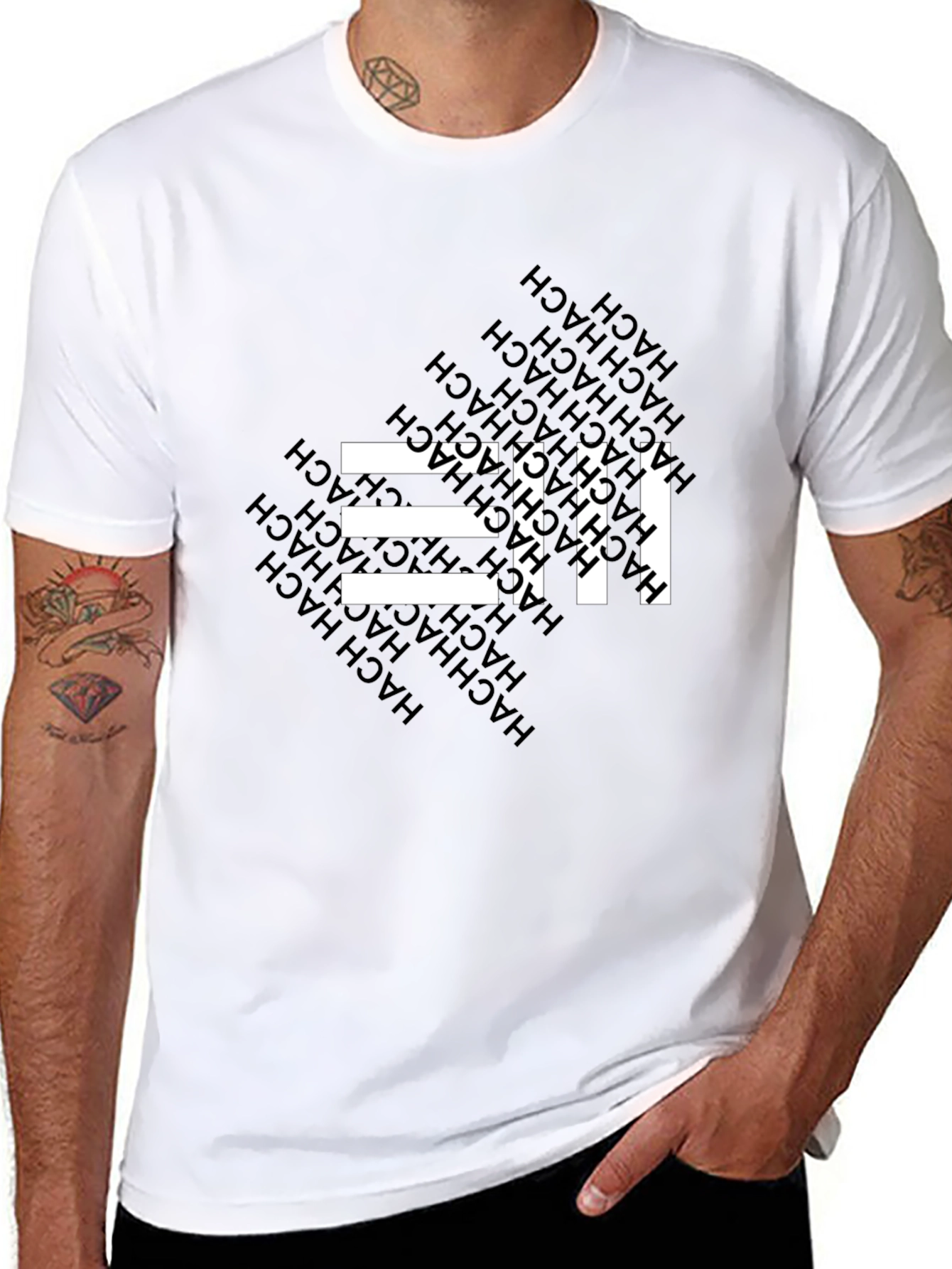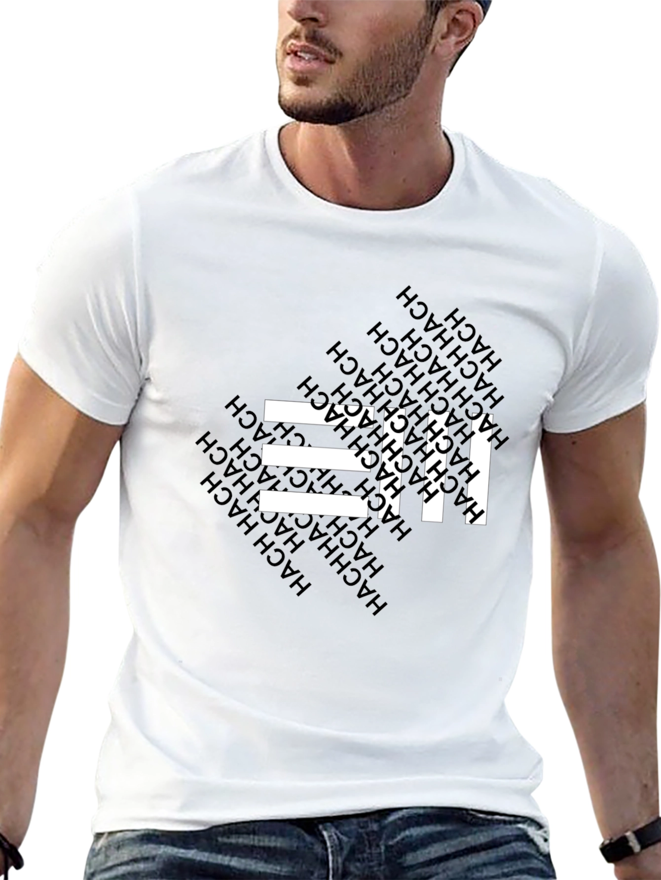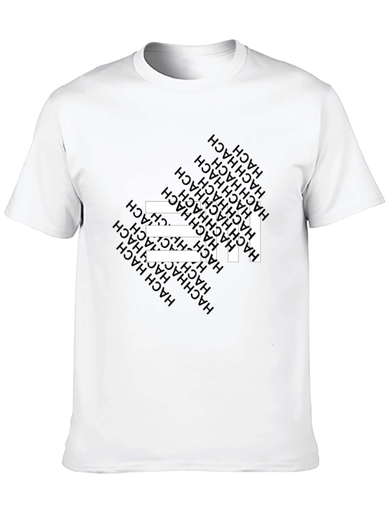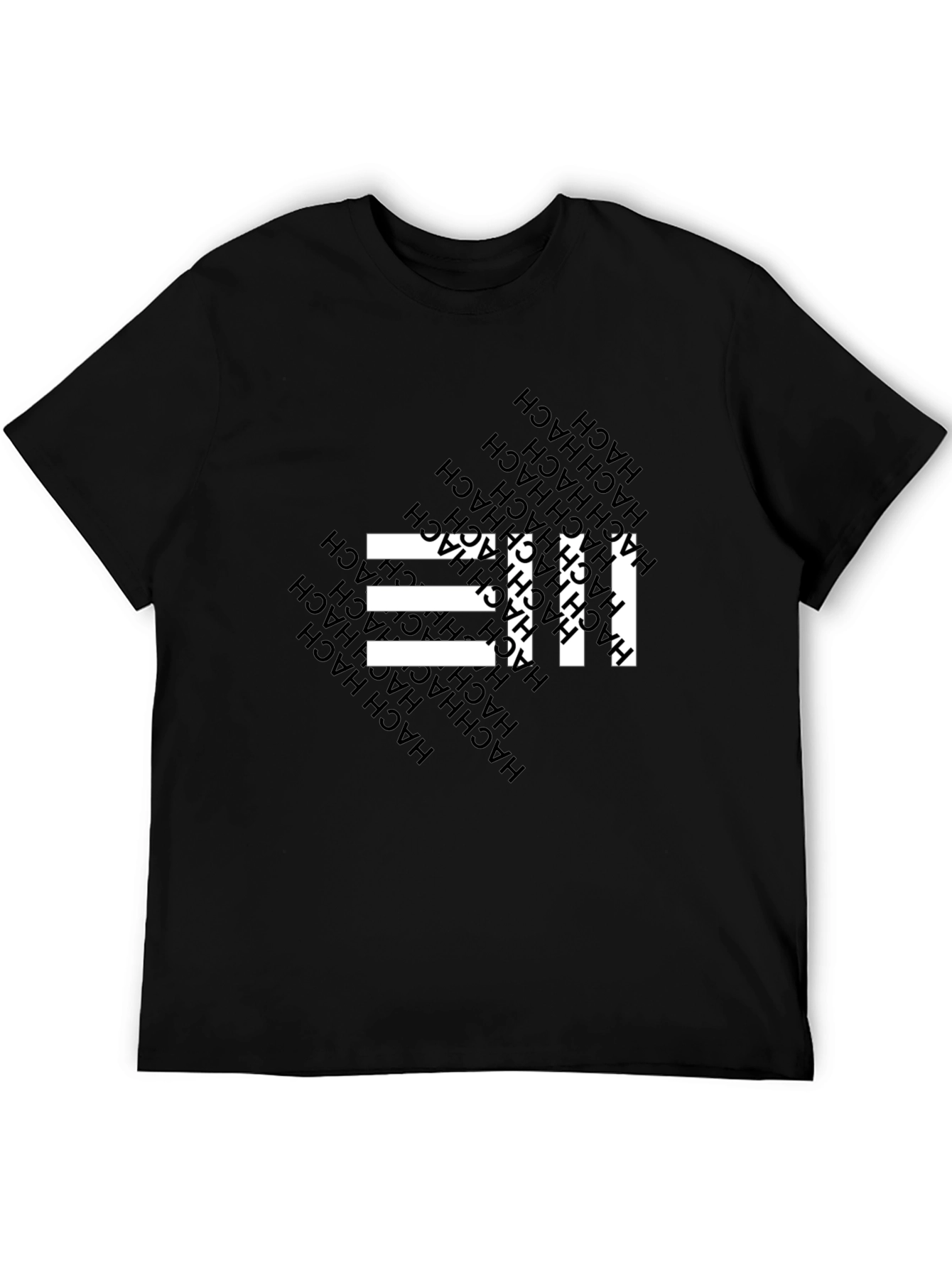 This black t-shirt features a striking graphic design with white horizontal bars intersected by a repeating vertical pattern. The word "HACH" is subtly incorporated into the background, adding a unique touch. Made from a comfortable material, this tee is perfect for everyday wear. Pair it with jeans or shorts for a casual yet stylish look. Whether you're hanging out with friends or running errands, this t-shirt is sure to make a statement. Its modern design and comfortable fit make it a versatile addition to any wardrobe.