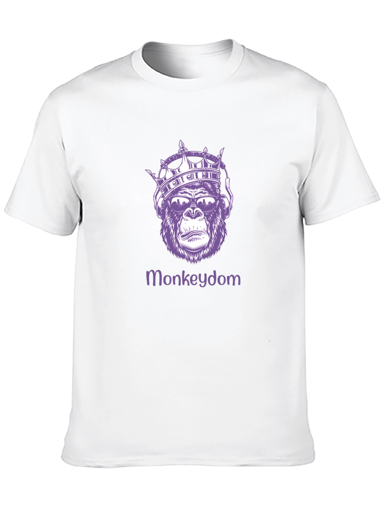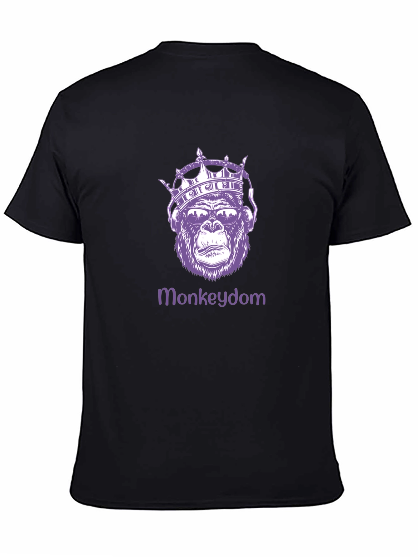 Elevate your style with this unique Monkeydom graphic tee! Featuring a regal gorilla wearing a crown and headphones, this black t-shirt makes a bold statement. The design, printed in a cool purple hue, adds a touch of royalty and urban flair. Made from comfortable materials, this tee is perfect for casual outings, concerts, or expressing your individual style. Pair it with jeans or shorts for a relaxed, trendy look. Show off your love for unique graphics and stand out from the crowd with this eye-catching tee!