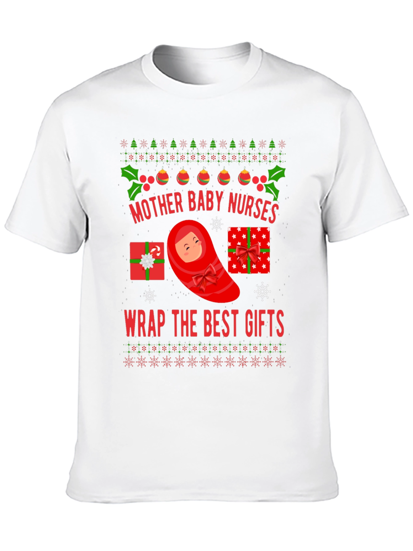 Celebrate the holidays with this adorable "Mother Baby Nurses Wrap the Best Gifts" T-shirt! This black t-shirt features a festive design with red and green accents, Christmas trees, ornaments, and holly. A cute graphic of a wrapped baby is centered between two wrapped gifts, making it perfect for nurses and mothers alike. The text is bold and clear, ensuring the message is easily readable. Ideal for holiday parties, work events, or just spreading Christmas cheer, this comfortable tee is sure to be a hit!