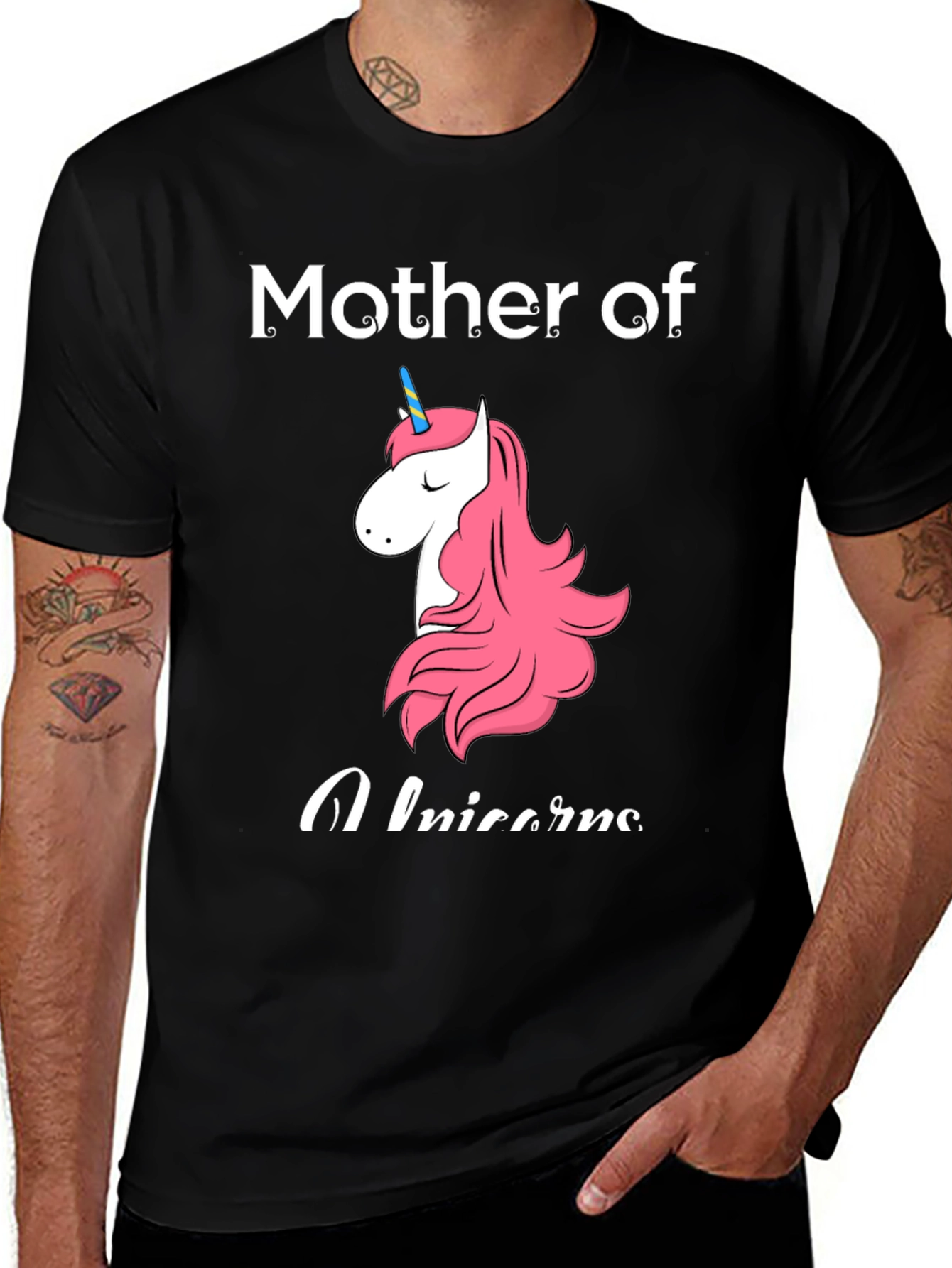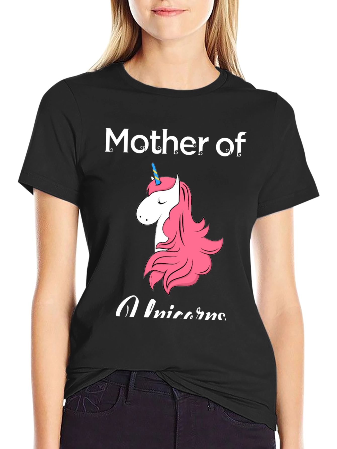 Show off your love for unicorns with this adorable black t-shirt! Featuring a charming unicorn graphic with a pink mane and tail, along with the words "Mother of Unicorns", this tee is perfect for unicorn-loving moms. Made from soft, comfortable fabric, it's ideal for casual wear, family outings, or a fun birthday party. The classic crew neck and short sleeves make it a versatile addition to any wardrobe. Let everyone know you're a proud unicorn mom with this stylish and playful t-shirt!