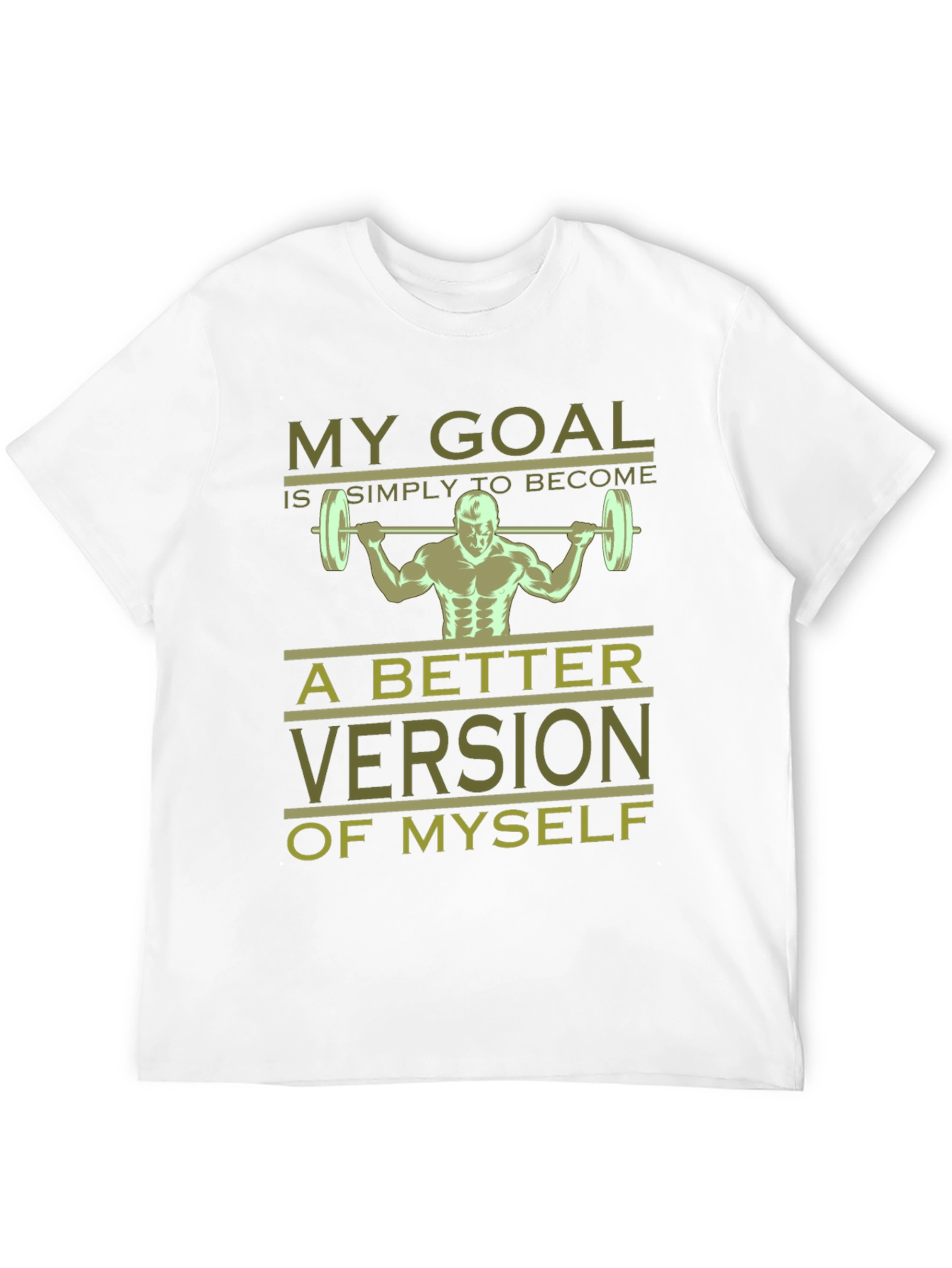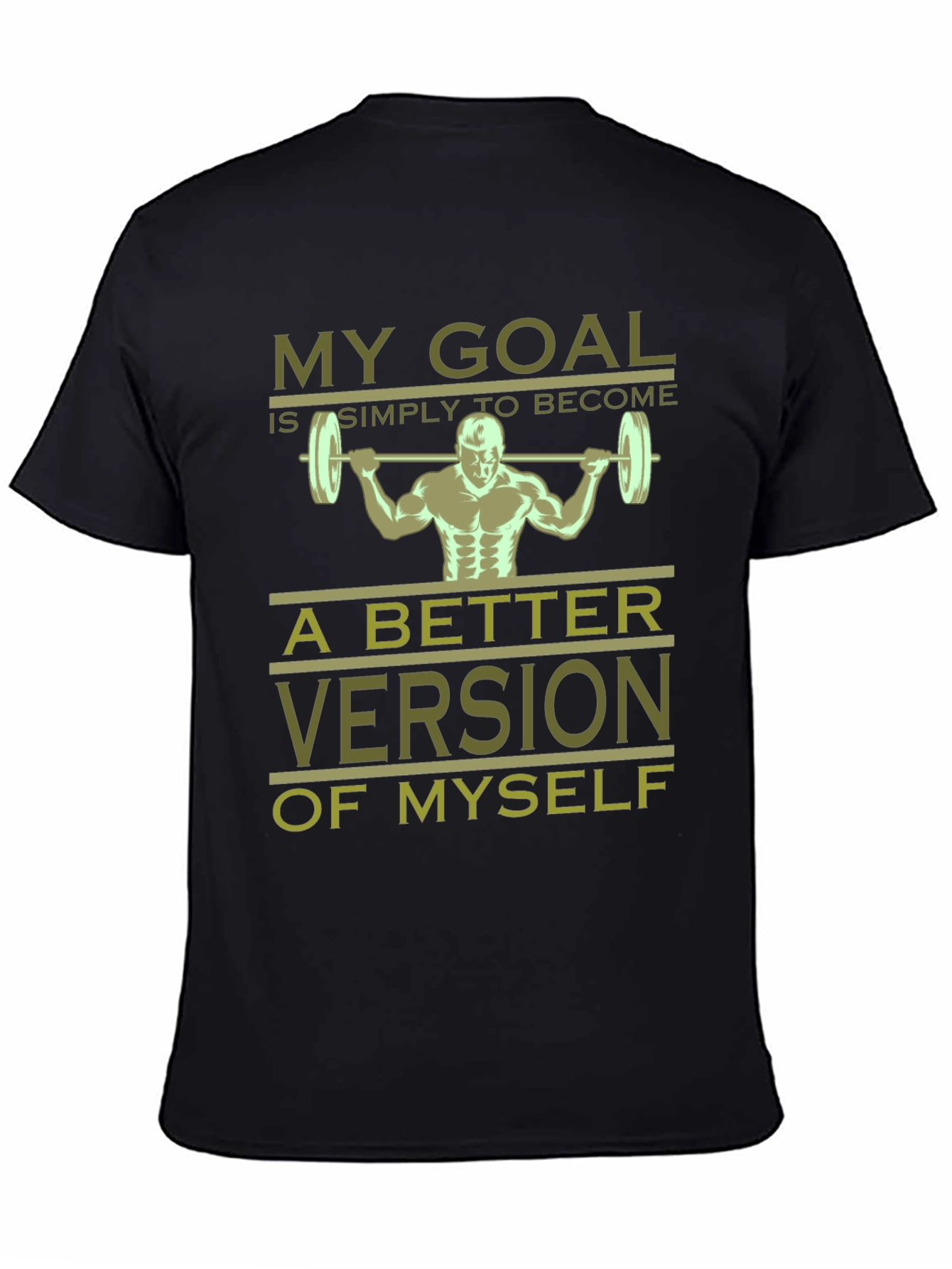 Show off your dedication to self-improvement with this motivational workout t-shirt. This black tee features a weightlifter graphic and the inspiring message "My Goal is Simply to Become a Better Version of Myself" in an olive green hue. Made from a comfortable-looking fabric, this t-shirt is ideal for gym sessions, casual wear, or as a gift for fitness enthusiasts. Let this shirt be a reminder of your commitment to progress and a healthier you. Get yours today and wear your goals!