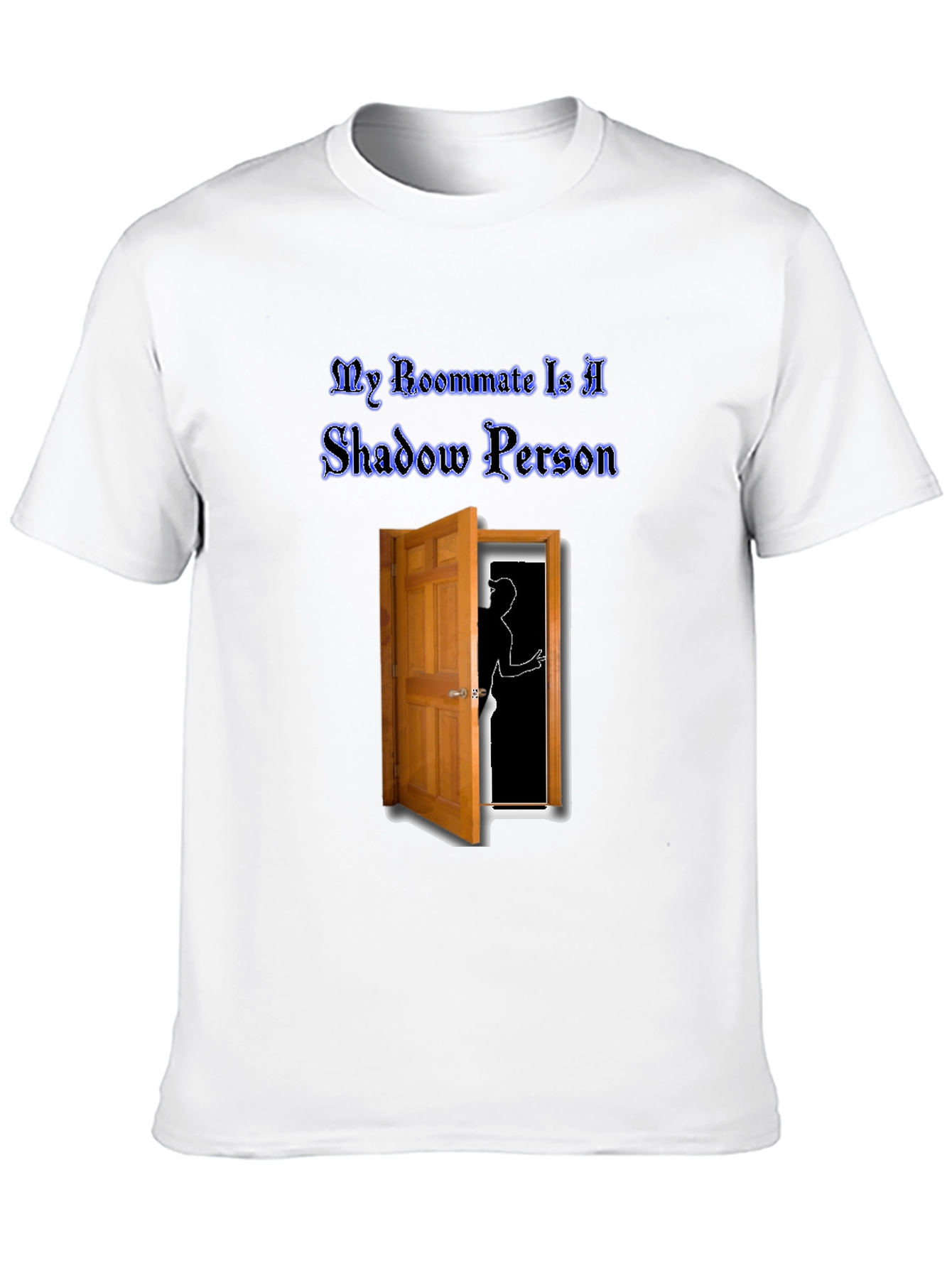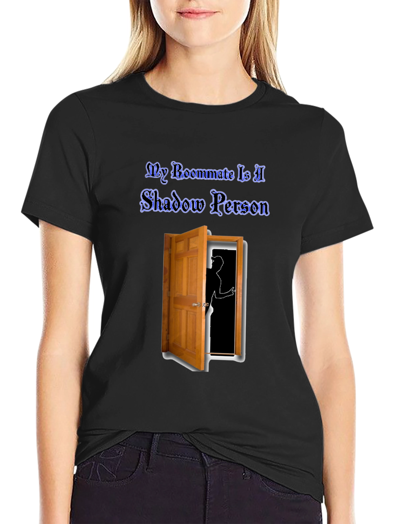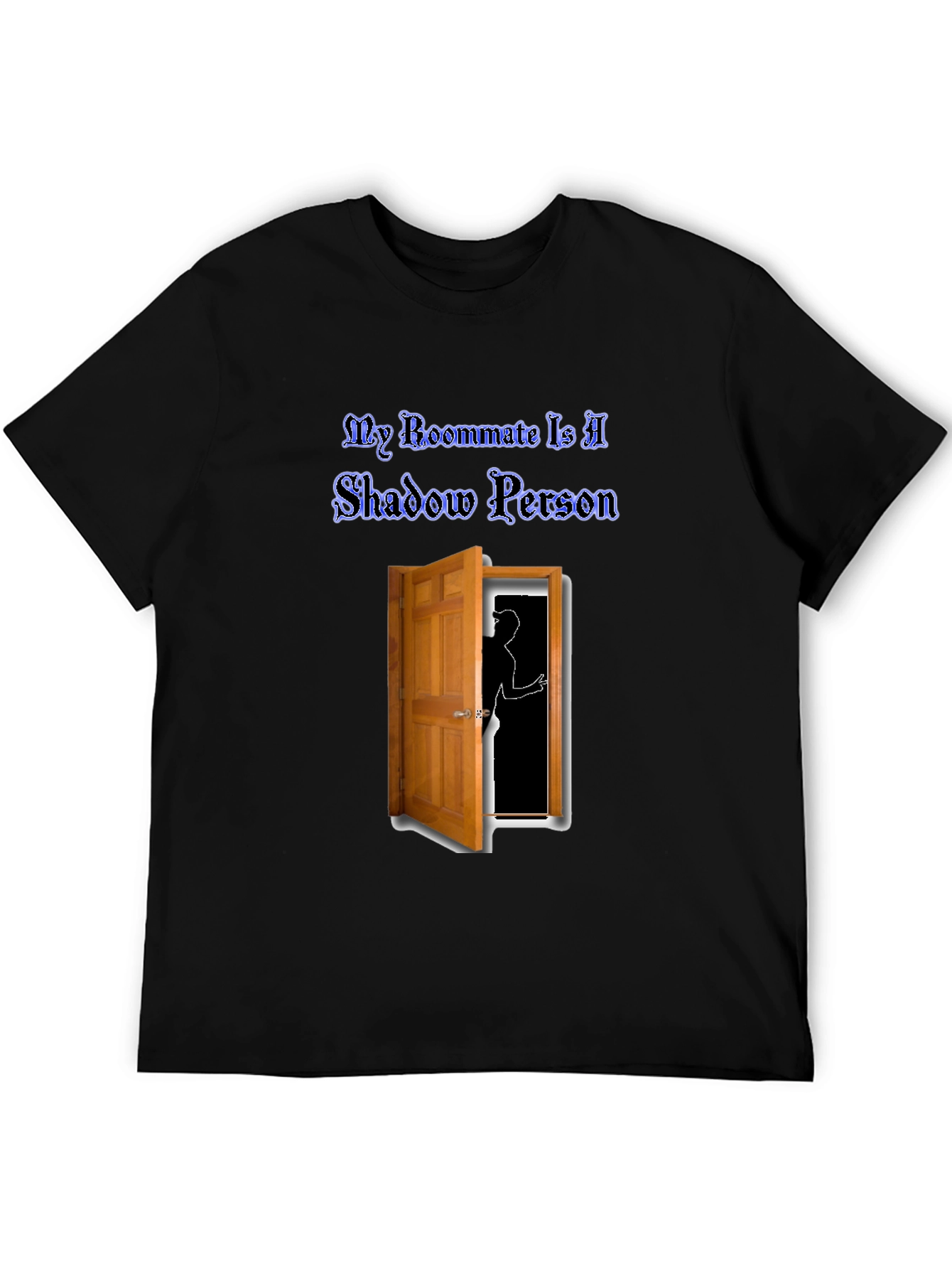 This black t-shirt features a unique and slightly spooky design. The graphic showcases an open wooden door with a shadowy figure standing within, accompanied by the text "My Roommate Is A Shadow Person" in an eye-catching font. The shirt appears to be made of a comfortable, breathable material, ideal for everyday wear. Perfect for those with a quirky sense of humor or an interest in the paranormal, this tee is sure to spark conversation and turn heads. Wear it casually or as a statement piece to express your unique personality and interests. A must-have for anyone looking to add a touch of mystery to their wardrobe.