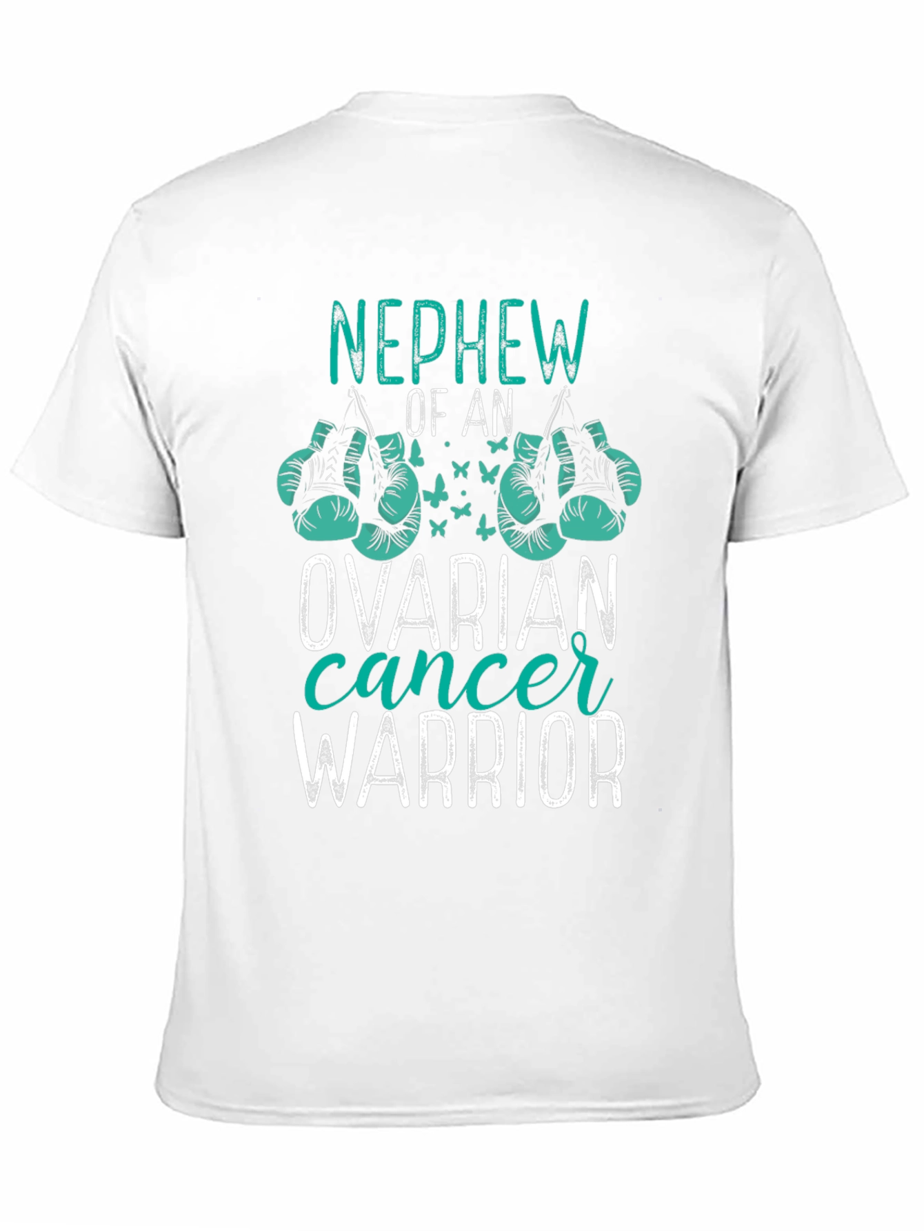 Show your support with this "Nephew of an Ovarian Cancer Warrior" t-shirt. The shirt features bold text, decorative boxing gloves, and butterflies in teal and white printed on a comfortable black fabric. Perfect for raising awareness, supporting a loved one, or wearing during ovarian cancer awareness events. This unique design makes a meaningful statement and shows you stand in solidarity with warriors fighting ovarian cancer. A great gift for a supportive family member!