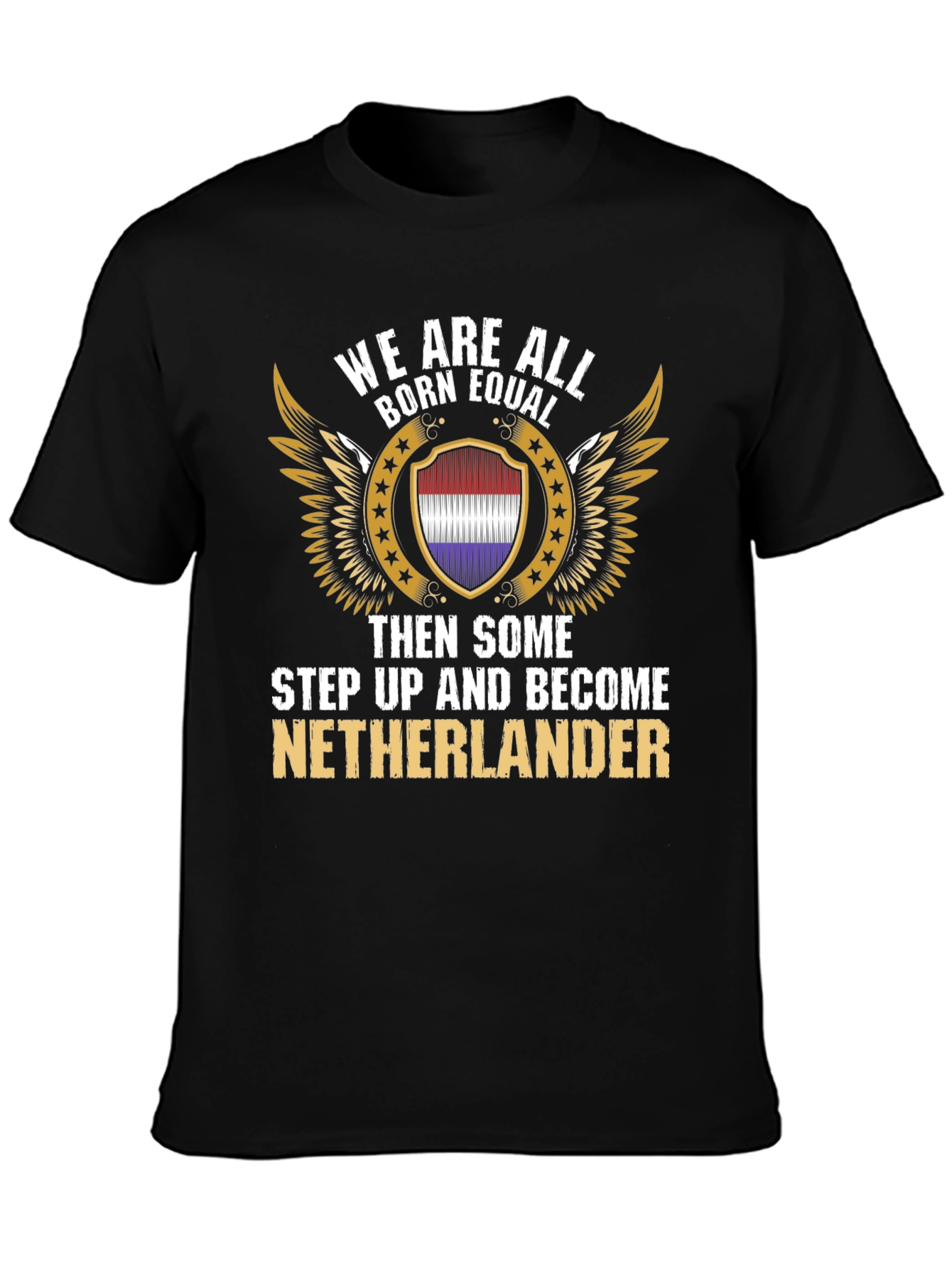 Show your pride with this striking black t-shirt. It features a bold graphic with the statement "We Are All Born Equal, Then Some Step Up and Become Netherlander." The design includes a shield emblem mirroring the Netherland flag, framed by golden wings and stars. This shirt is perfect for casual wear, showcasing your heritage or making a statement. The classic crew neck and comfortable fit make it a versatile addition to any wardrobe. Wear it to cultural events, family gatherings, or just around town to show your Netherlander pride.