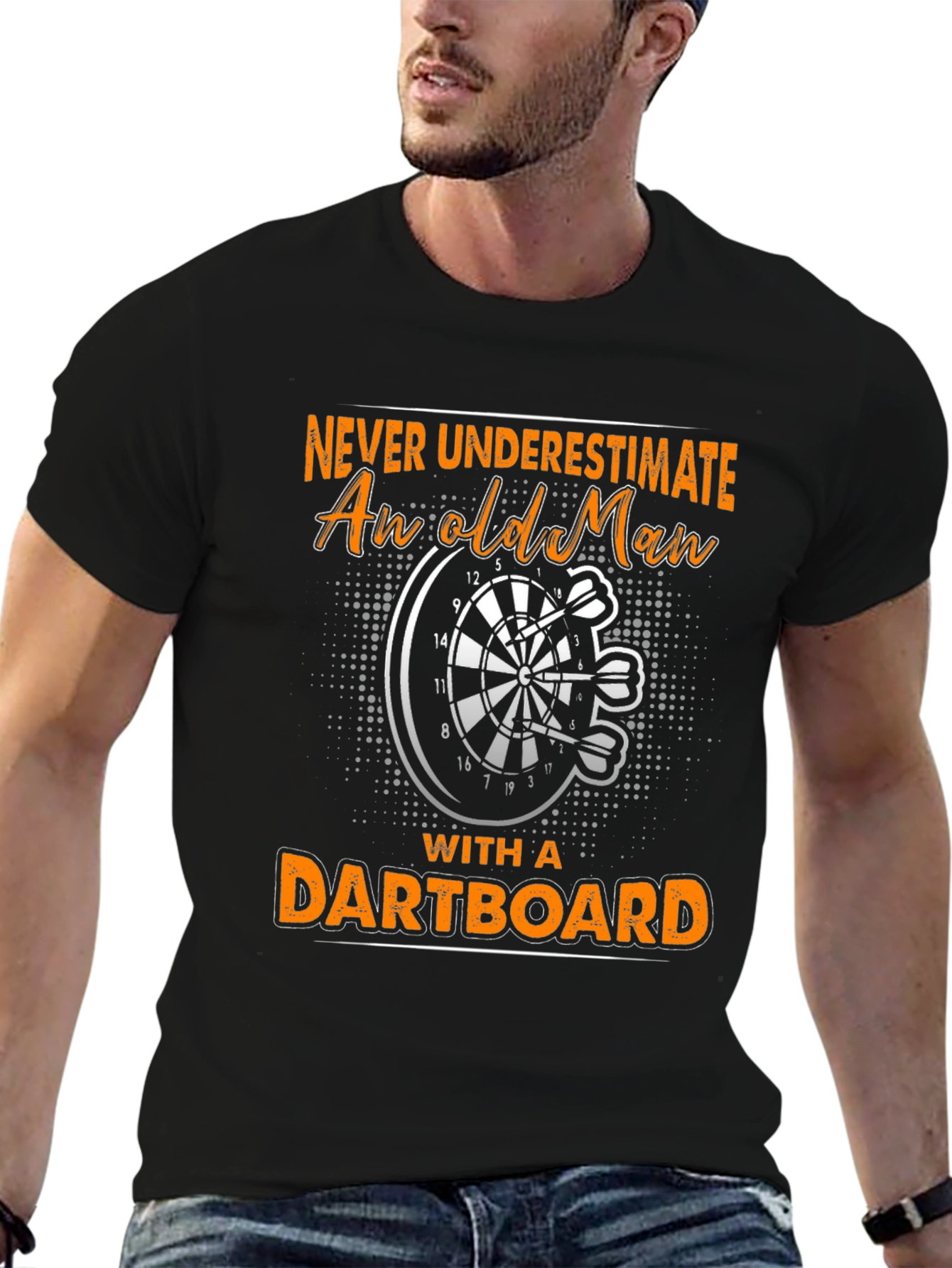 Show off your love for darts with this unique t-shirt! Featuring a bold design with the text "Never Underestimate An Old Man With A Dartboard" encircling a dartboard graphic with three darts, this shirt is perfect for any dart enthusiast. Made from a comfortable, breathable fabric, this short-sleeved tee is ideal for casual wear, dart tournaments, or lounging at home. The design's distressed orange text and halftone patterns add a touch of vintage flair. A must-have for anyone who takes their dart game seriously!