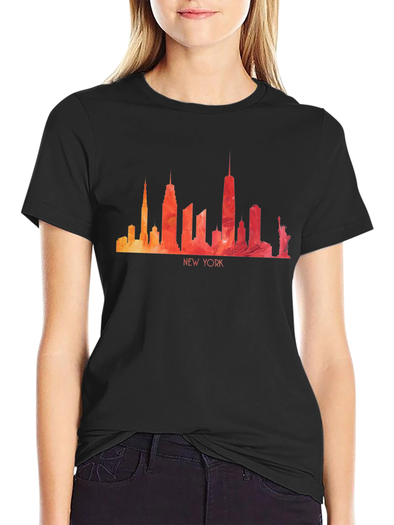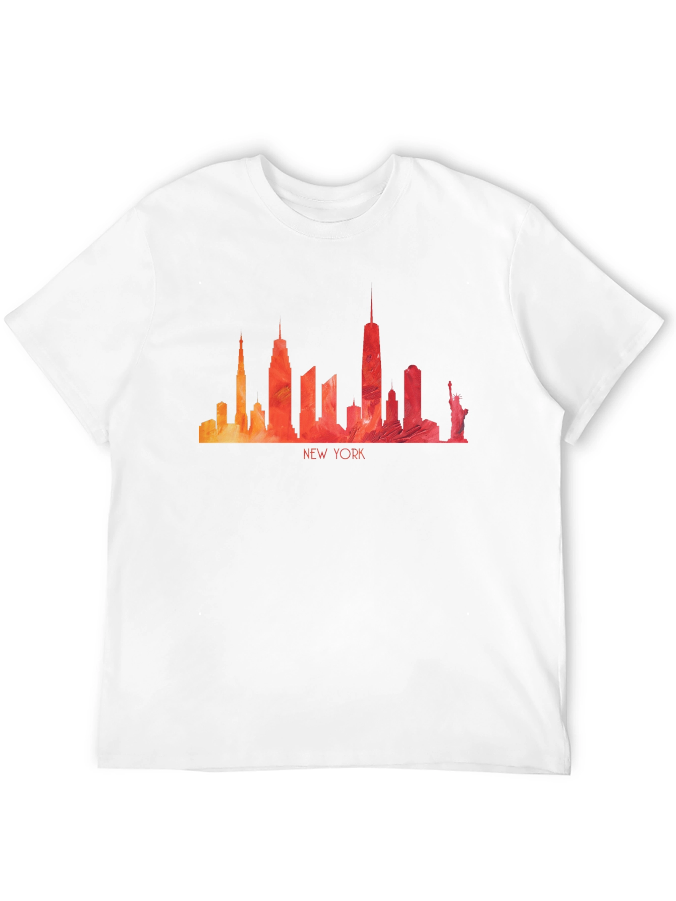 Show your love for the Big Apple with this stylish black t-shirt. Featuring a vibrant, watercolor-style New York City skyline, including iconic buildings and the Statue of Liberty, this tee makes a bold statement. The design incorporates a gradient of warm hues, adding an artistic touch to the classic black backdrop. Made from a comfortable fabric blend, it's perfect for casual wear or layering. Whether you're a New Yorker at heart or simply appreciate stunning cityscapes, this t-shirt is a must-have addition to your wardrobe. Dress it up or down, this tee is perfect for everyday wear or as a unique gift.