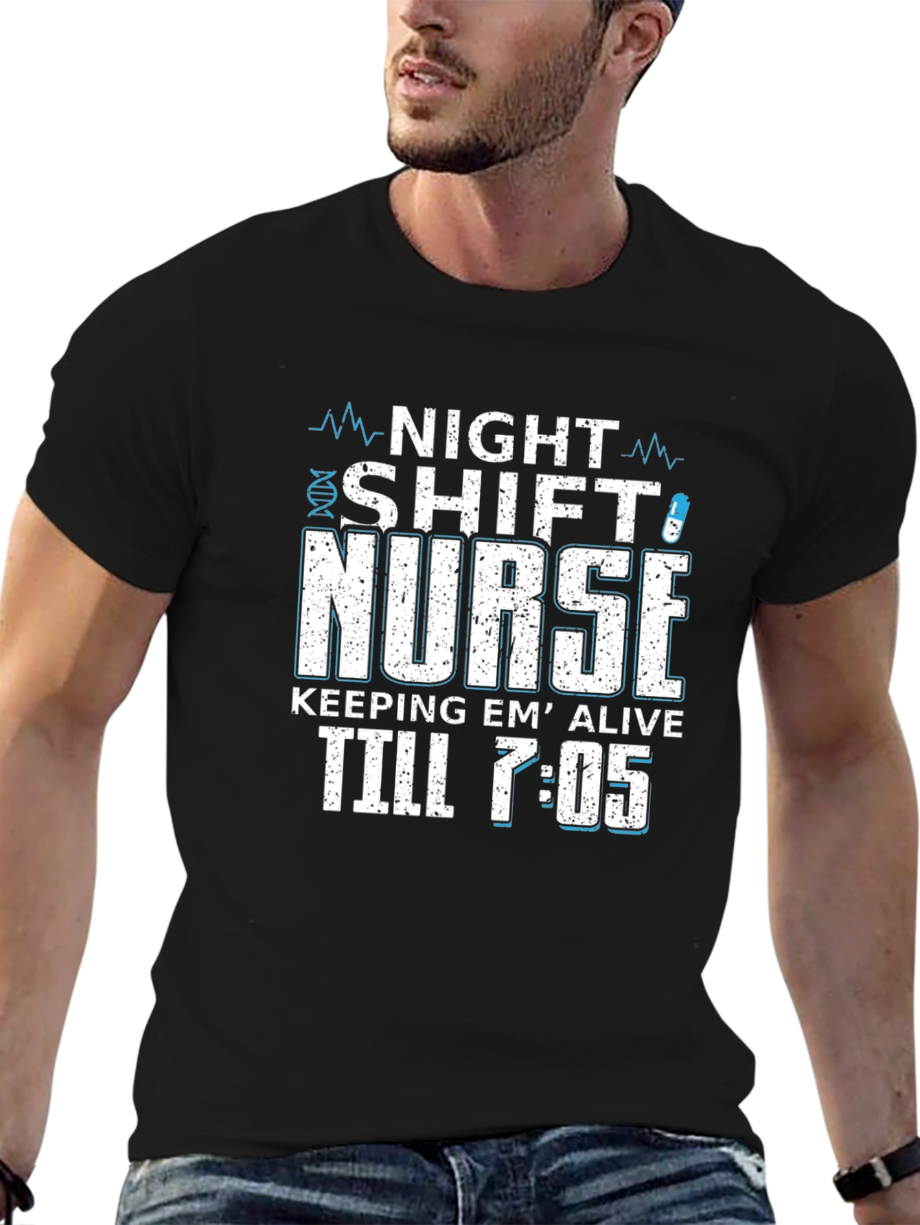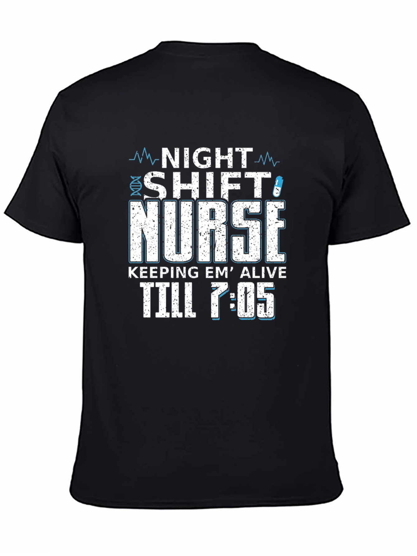 This bold black t-shirt is perfect for the dedicated night shift nurse! The design features the words "Night Shift Nurse" in a distressed, blocky font, with a medical DNA strand graphic. Below, "Keeping 'Em Alive Till 7:05" is emblazoned, adding a touch of humor and truth. Made from a comfortable-looking fabric, this shirt is ideal for long shifts and casual wear alike. Show off your dedication and sense of humor with this unique nurse t-shirt!