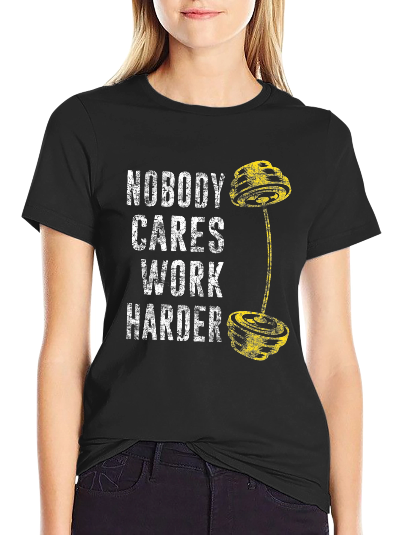Show off your dedication with this black graphic t-shirt. The shirt features the inspirational phrase "Nobody Cares Work Harder" in a distressed white font, accompanied by a striking yellow weightlifting barbell graphic. Crafted from a comfortable, breathable fabric blend, this short-sleeve tee is ideal for workouts, casual outings, or simply making a statement. The bold design is perfect for gym enthusiasts, athletes, or anyone who values hard work and perseverance. Make a statement at the gym with this unique shirt!
