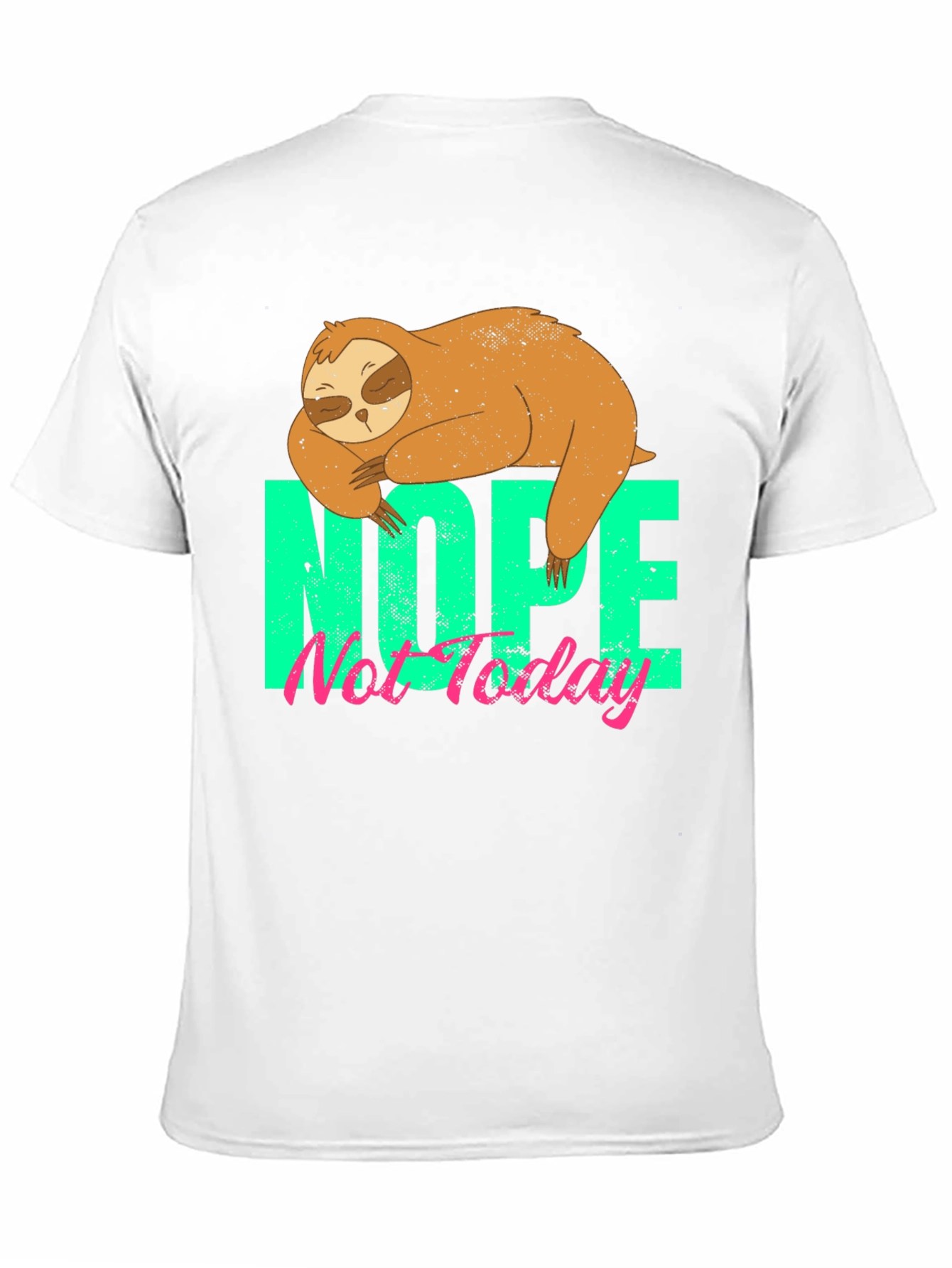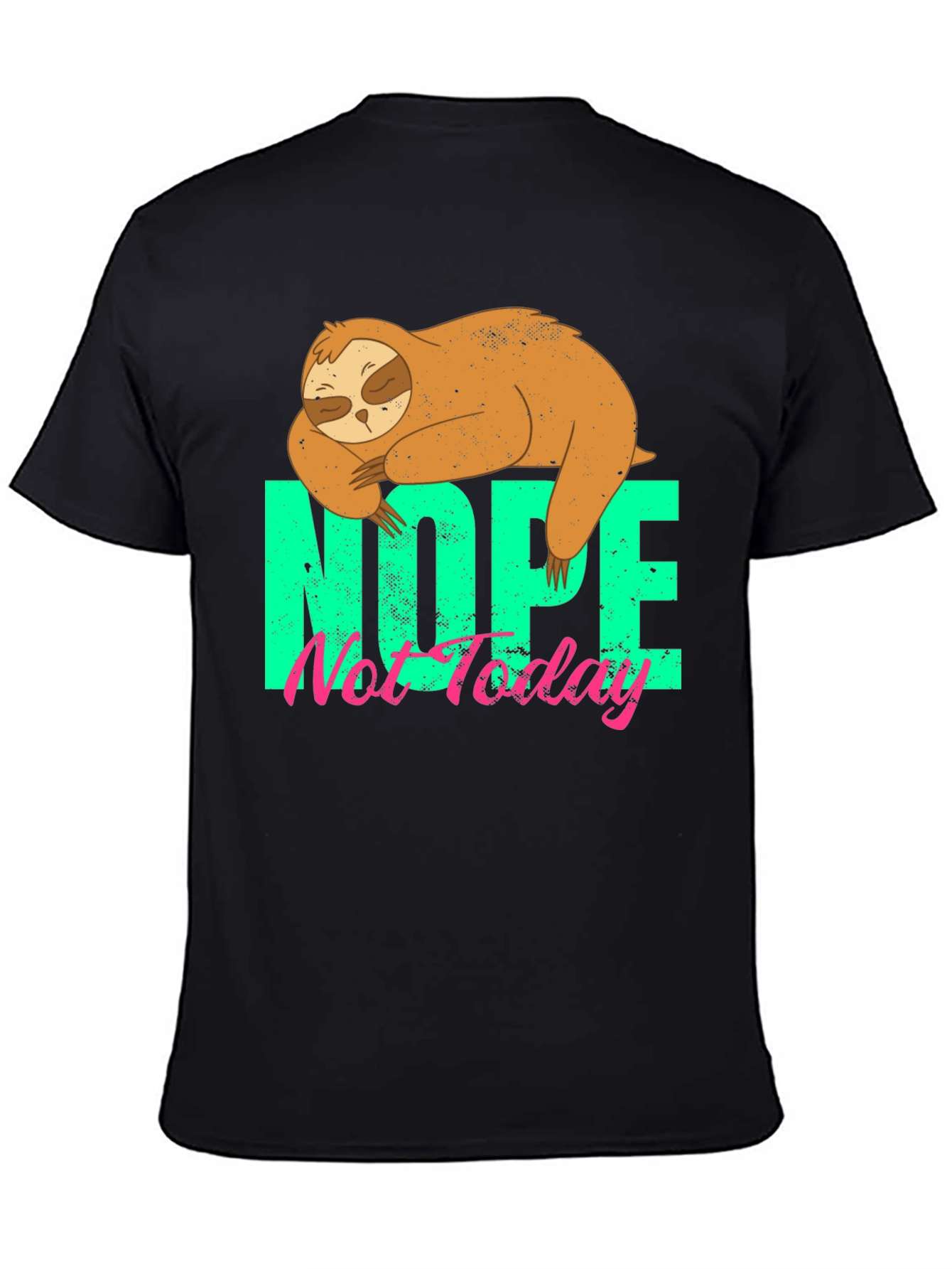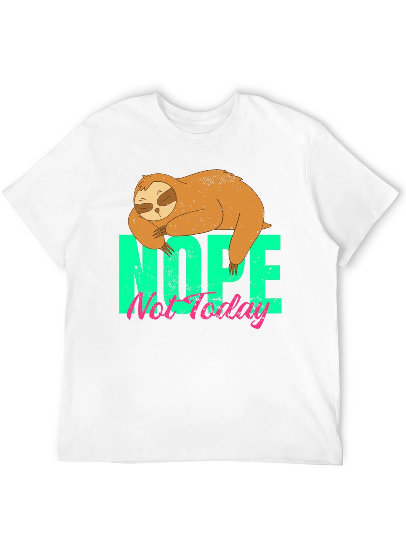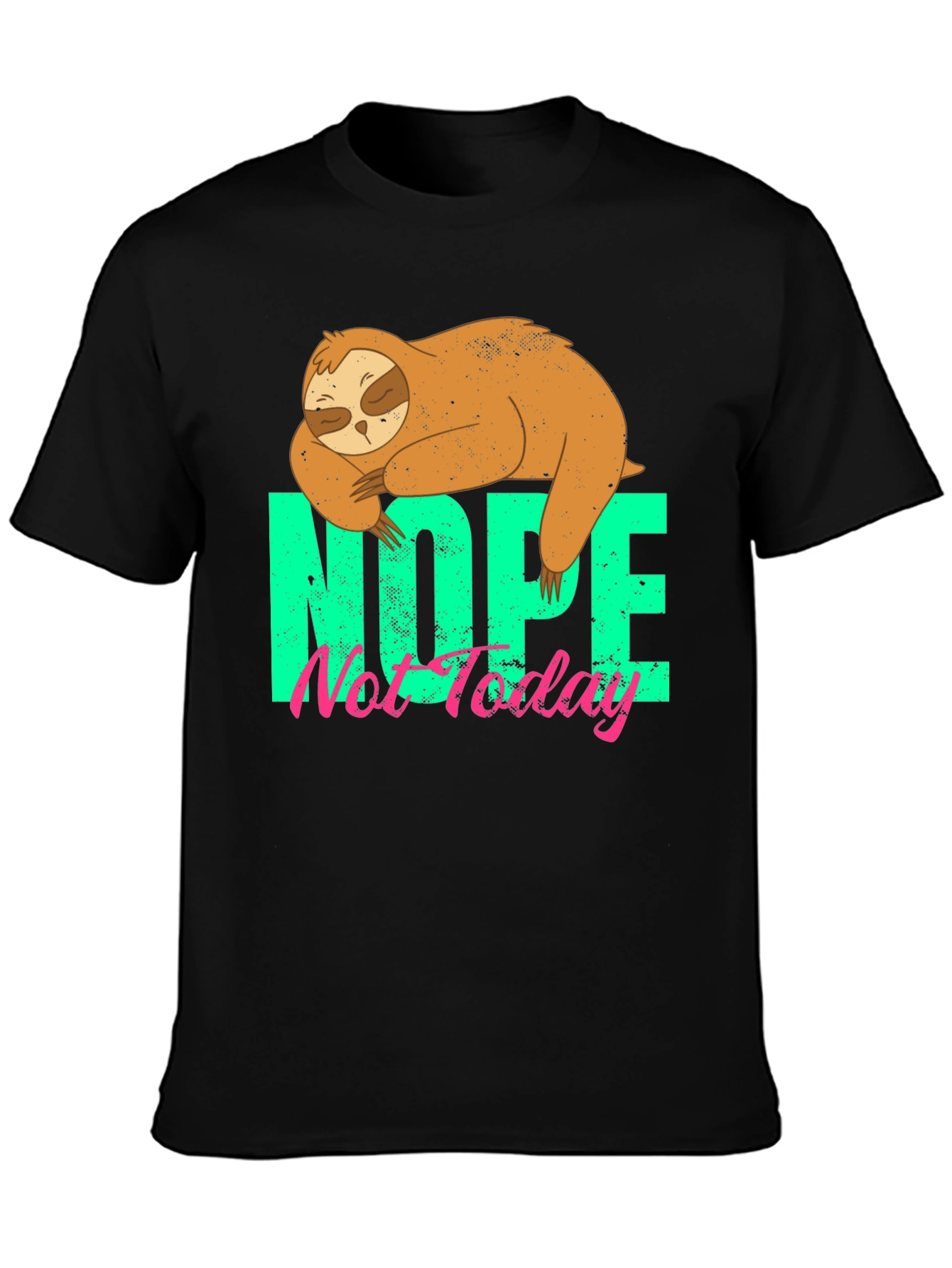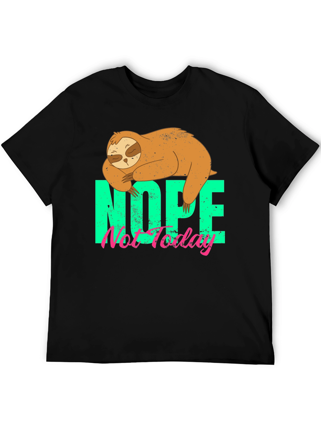 Embrace relaxation with this amusing graphic tee. The shirt features a cute, sleepy sloth illustration laying atop the word 'NOPE' in a vibrant green, complemented by 'Not Today' in pink. Crafted from a soft fabric, this short-sleeved shirt offers all-day comfort and a relaxed fit. Ideal for casual wear, lounging at home, or making a statement, this tee is a fun addition to your wardrobe. Show off your laid-back attitude with this unique and eye-catching design.