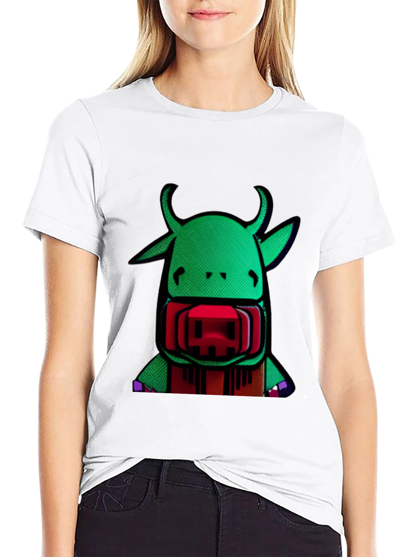 Make a bold statement with this eye-catching black t-shirt! Featuring a unique graphic print of a pixelated green cow-like creature with red accents, this shirt is sure to turn heads. The design is vibrant and attention-grabbing, adding a touch of playful personality to your wardrobe. Made from soft, breathable fabric, this t-shirt offers all-day comfort and style. Perfect for casual outings, concerts, or expressing your individuality. Pair it with jeans, shorts, or layer it under a jacket for a versatile look. Get ready to stand out from the crowd with this must-have graphic tee!