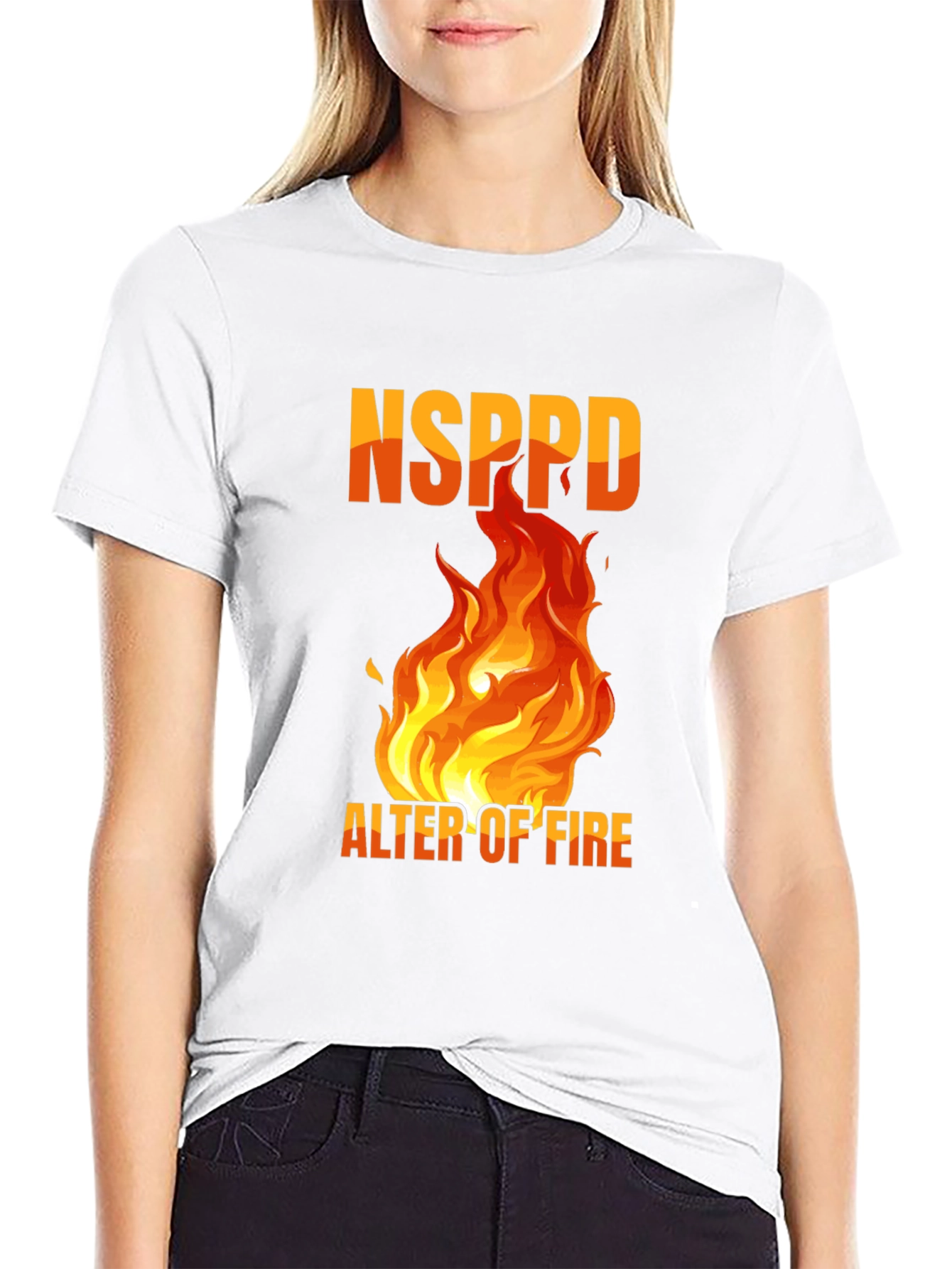 Ignite your style with this bold black t-shirt featuring a fiery graphic. The design showcases "NSPPD" above a vibrant flame illustration, with "ALTER OF FIRE" printed underneath, all in eye-catching orange and yellow hues. Crafted from comfortable fabric, this tee is perfect for casual wear, concerts, or expressing your unique personality. It's a striking statement piece that adds a touch of heat to any outfit. Grab yours today and turn heads wherever you go!