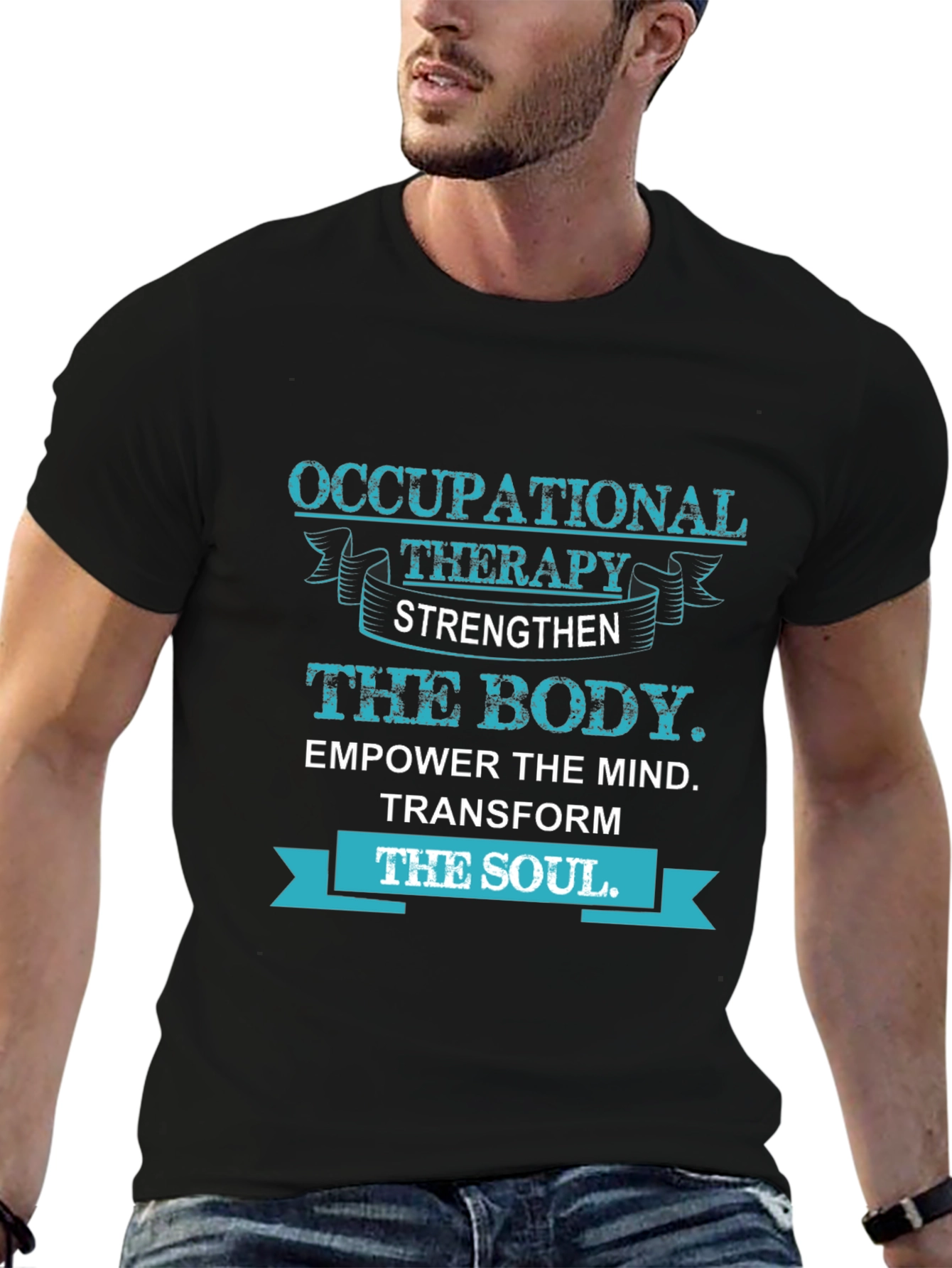 This stylish black t-shirt features a unique design celebrating occupational therapy. The design, rendered in a striking blue, proclaims "Occupational Therapy Strengthen the Body. Empower the Mind. Transform the Soul." This shirt is perfect for occupational therapists, students, or anyone who appreciates the power of healing and rehabilitation. Made from what appears to be a comfortable cotton blend, this classic fit tee is ideal for everyday wear, whether at work, the gym, or casual outings. Show your passion for occupational therapy with this meaningful and eye-catching t-shirt. It also makes a thoughtful gift for the healthcare hero in your life.