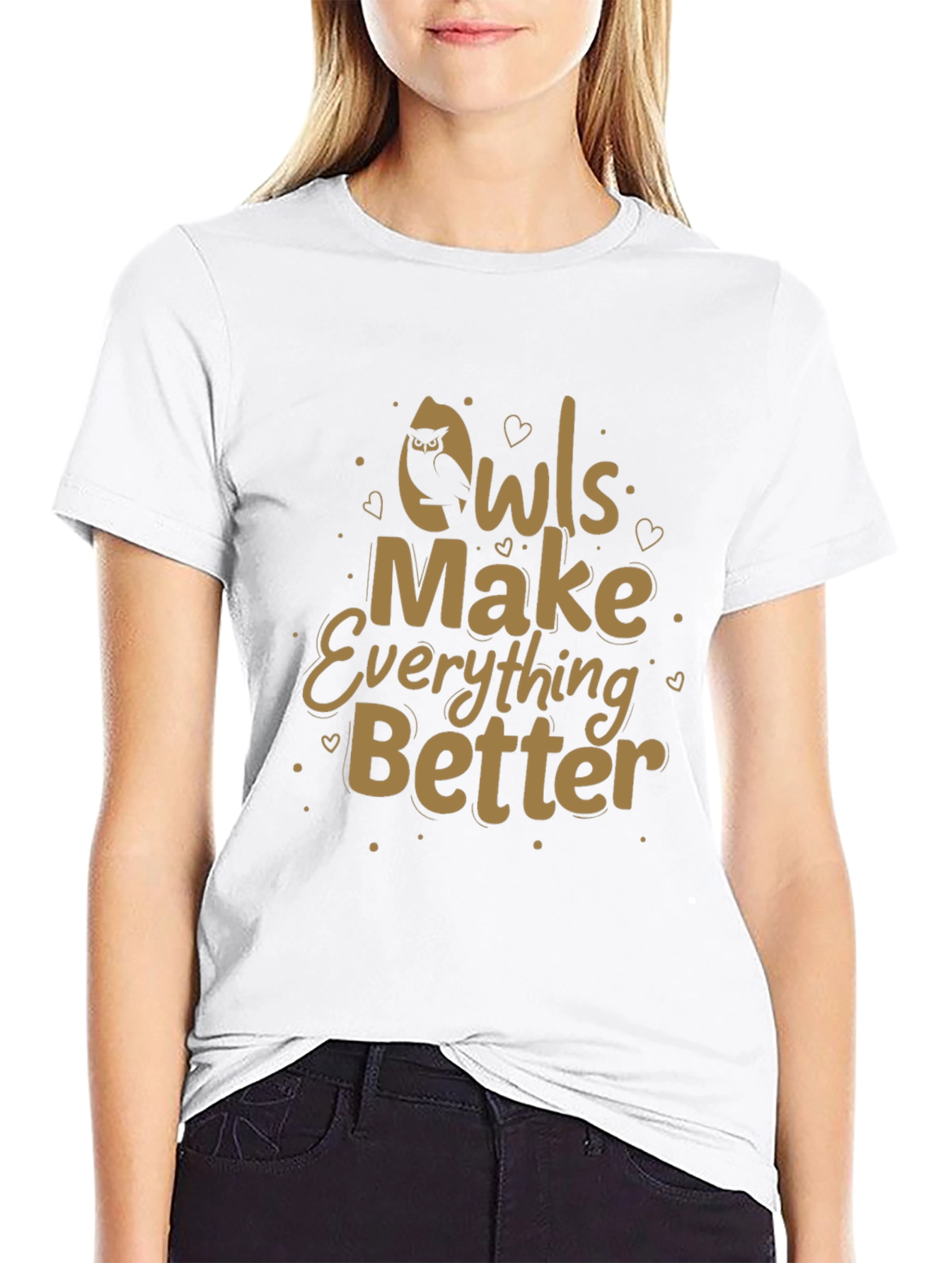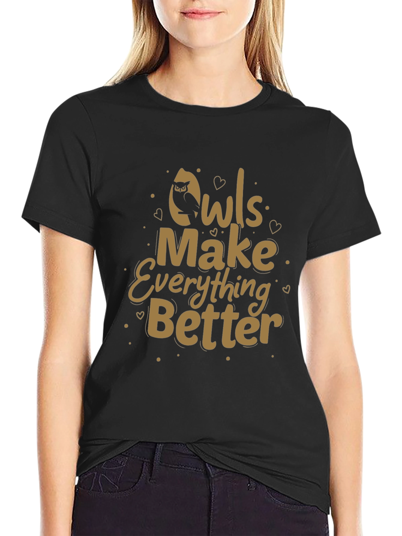 This stylish black tee features a cute and whimsical graphic that celebrates the charm of owls. The design showcases the phrase "Owls Make Everything Better" in a playful, inviting font, complete with an adorable owl illustration and small heart accents. Made from a comfortable, soft fabric, this t-shirt is perfect for everyday wear and casual occasions. The print has a vintage look that is sure to make a statement. Show off your love for these wise and enchanting creatures with this unique and eye-catching piece. It is a perfect gift for owl enthusiasts or anyone who appreciates unique graphic designs. Pair it with jeans, shorts, or a skirt for a fun and stylish look. Add a touch of personality to your wardrobe today!