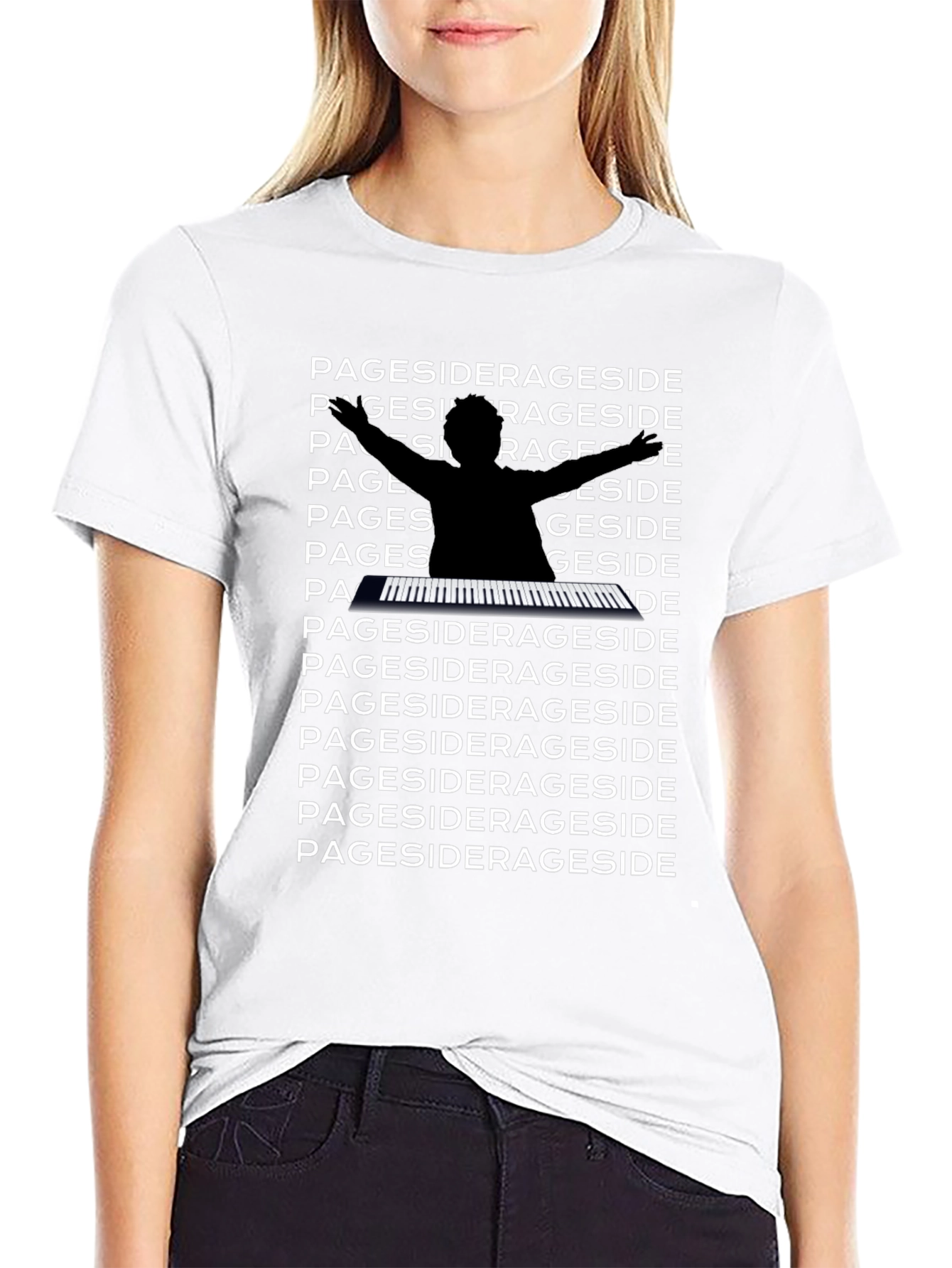 Showcase your musical passions with this unique black graphic tee. The design features repeated "Pageside" text in bold white, surrounding a silhouette of a pianist and a keyboard. The shirt appears to be made from a soft, comfortable fabric. This tee is perfect for musicians, music lovers, or anyone who appreciates a creative, eye-catching design. Wear it casually with jeans, or dress it up with a jacket for a night out. Its bold graphics will definitely make a statement wherever you go! Let your style reflect your passion with this one-of-a-kind t-shirt.