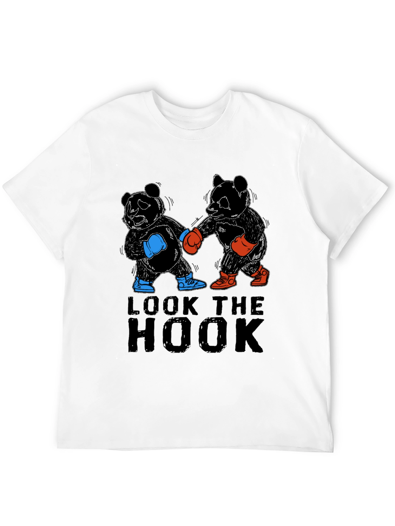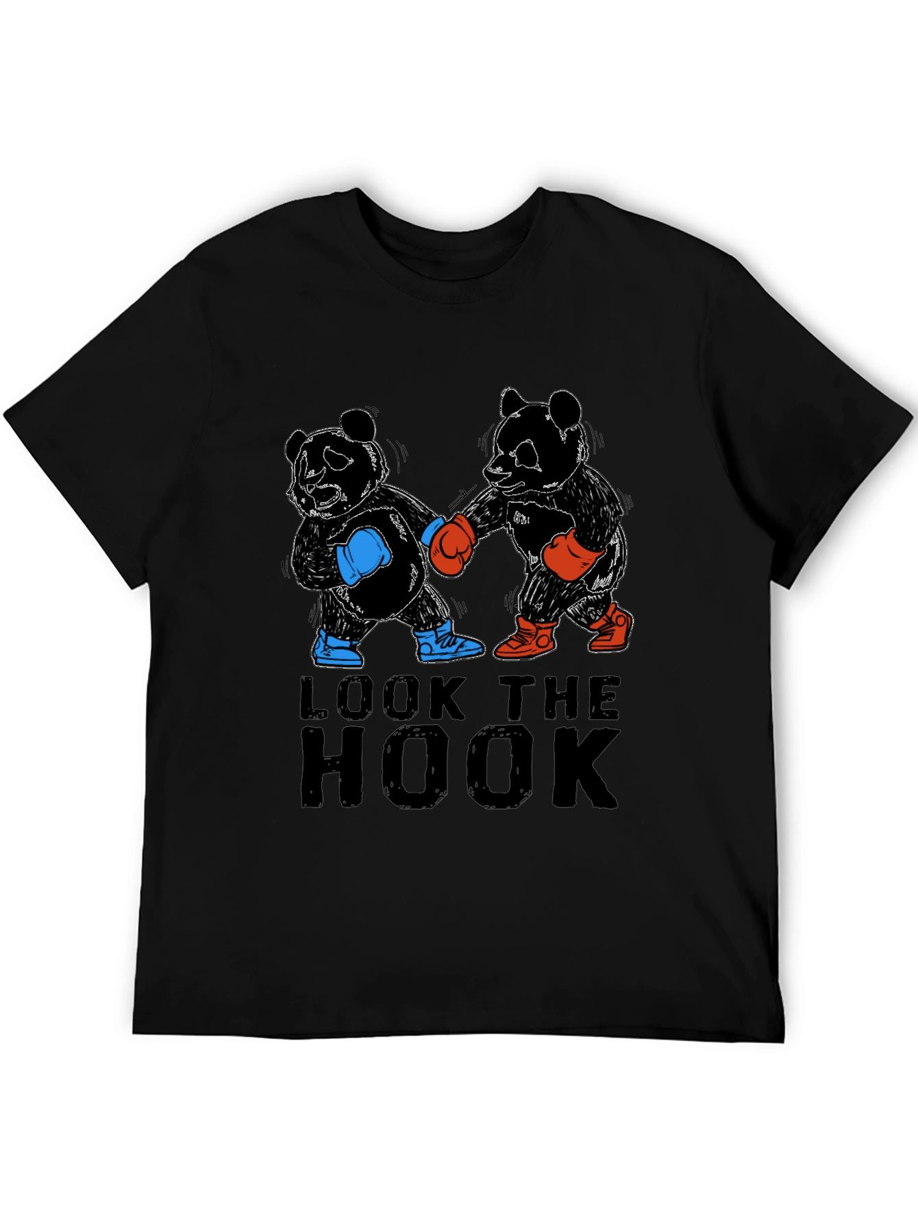 This striking black t-shirt features a playful yet powerful graphic design. Two panda bears are depicted as boxers, complete with boxing gloves and shoes in contrasting red and blue. Bold lettering above the pandas reads "LOOK THE HOOK", adding a clever and memorable touch. Made from what appears to be soft and breathable cotton fabric, this tee offers both style and comfort. The classic crew neck and short sleeves make it ideal for casual wear, workouts, or making a statement wherever you go. This t-shirt is a perfect choice for those who appreciate unique and eye-catching designs.