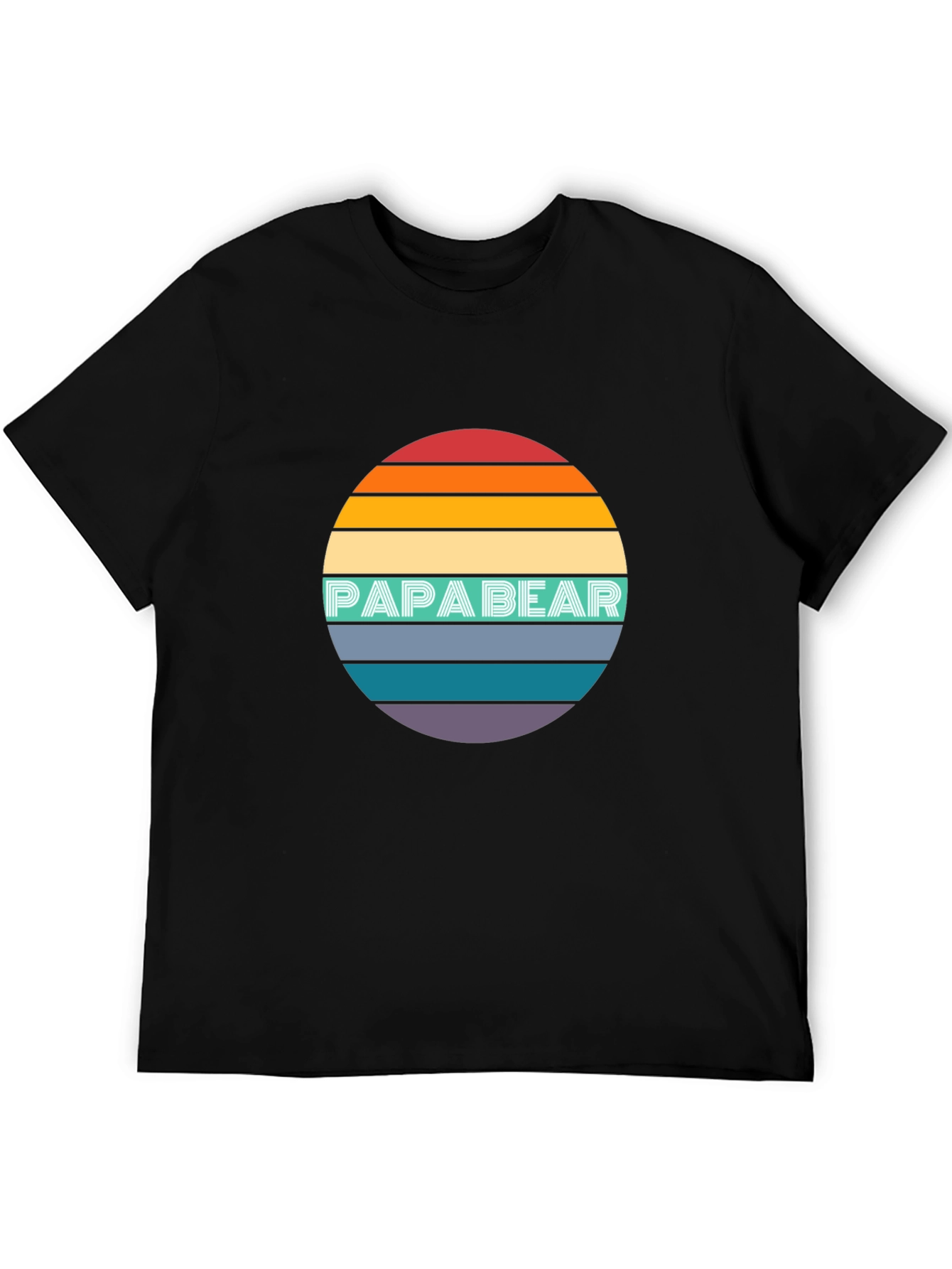 Show your love for dad with this stylish 'Papa Bear' T-shirt. Featuring a retro-inspired sunset design in vibrant red, orange, yellow, teal, blue and purple hues, this shirt is sure to turn heads. The bold, teal-colored 'Papa Bear' text adds a playful touch. Made from a soft and comfortable black fabric, it's perfect for everyday wear. This tee would make an excellent Father's Day gift, or just a fun way to show appreciation for the amazing dad in your life. Let Papa Bear shine with this unique and eye-catching T-shirt!