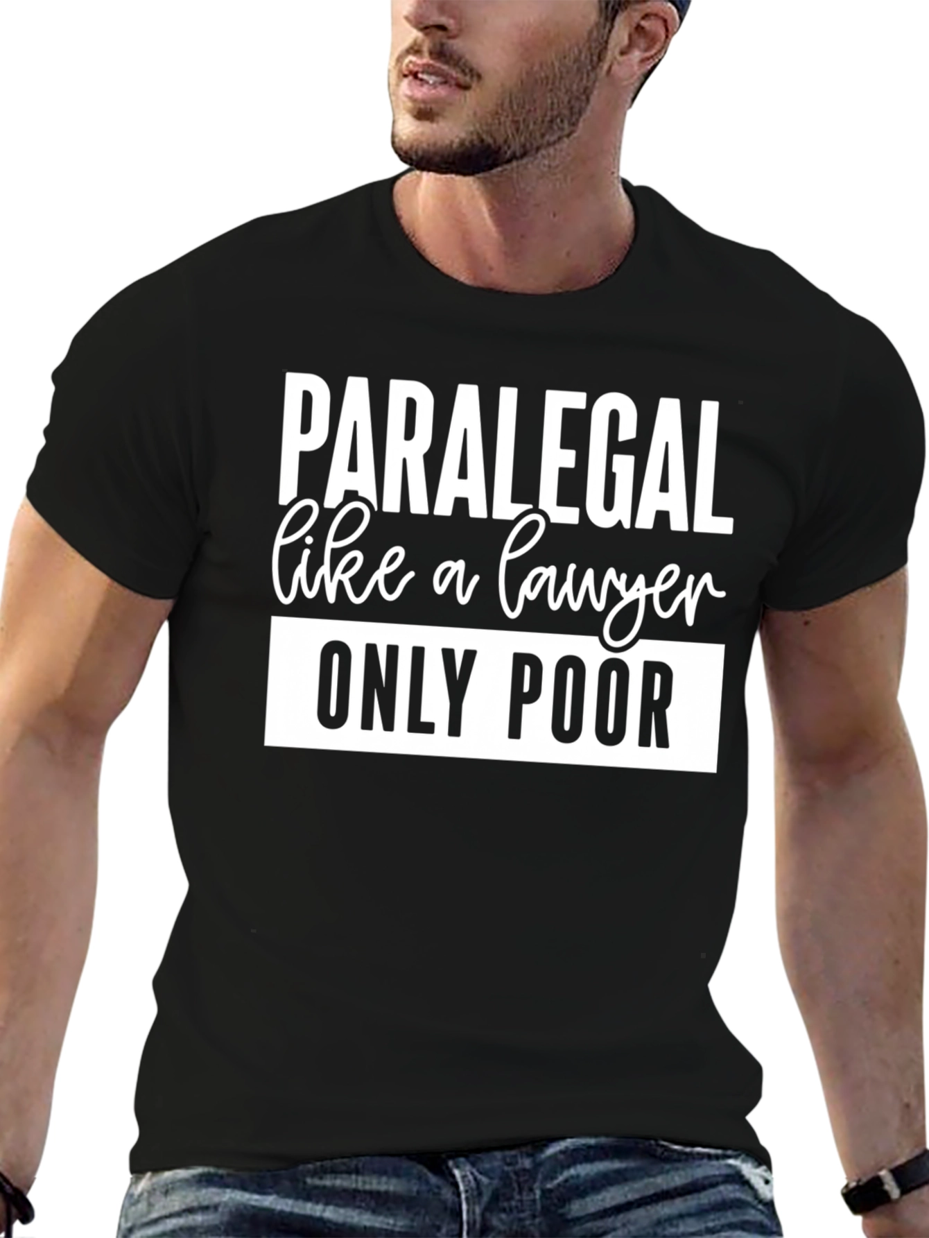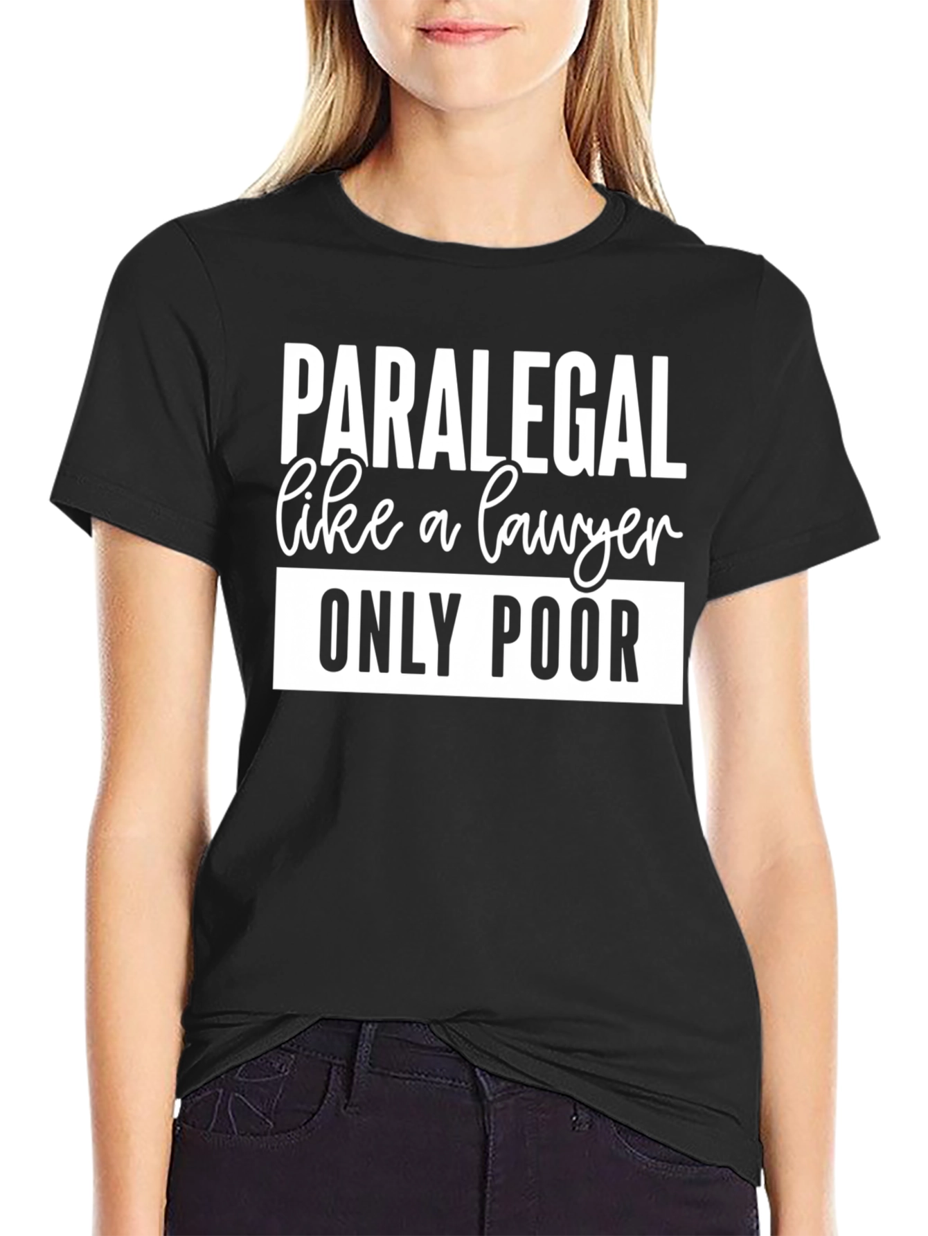 This black t-shirt features a bold, humorous statement perfect for paralegals with a sense of humor. The text "PARALEGAL like a lawyer ONLY POOR" is displayed in a clean, white font. The shirt appears to be made of a soft, comfortable material, ideal for everyday wear. This tee is a great way to express your profession with a touch of lightheartedness. Wear it to work, casual outings, or as a fun gift for your favorite paralegal. Comfortable and sure to bring a smile!