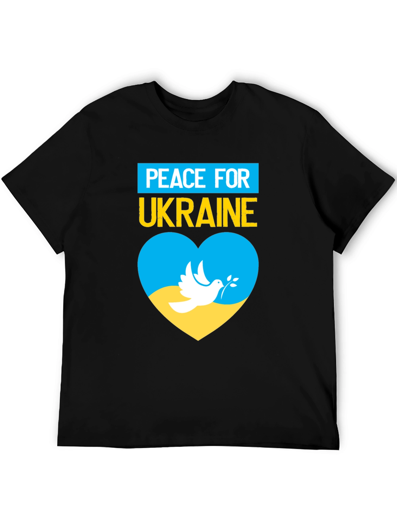 Show your support with this striking black t-shirt featuring a powerful "Peace for Ukraine" design. The graphic includes a blue banner with the text "PEACE FOR" above the text "UKRAINE" in yellow. Beneath that, a heart shape rendered with the colors of the Ukrainian flag, a white dove holding a branch within. Ideal for expressing solidarity and raising awareness, this tee is perfect for everyday wear, rallies, or events. Made from a comfortable fabric, it offers both style and a meaningful message. Stand in unity and make a statement with this eye-catching t-shirt.