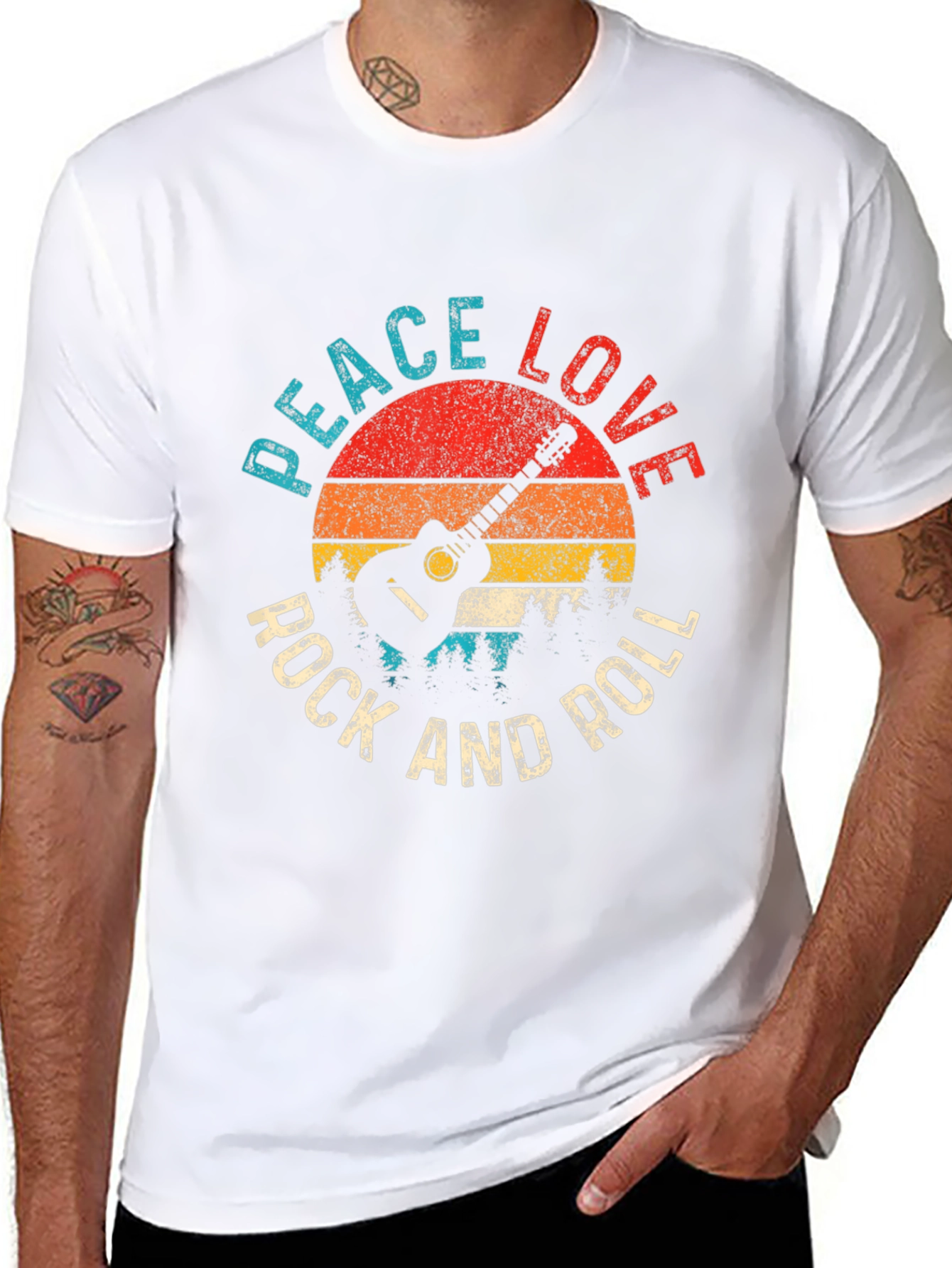 This black t-shirt features a vintage-inspired graphic design. It showcases a silhouette of an acoustic guitar over a colorful sunset backdrop. The words "Peace Love Rock and Roll" encircle the design, creating a harmonious blend of music and positive vibes. The distressed effect adds a cool, retro touch. Made from a soft, comfortable fabric, this tee is perfect for casual wear. It's ideal for music lovers, concert-goers, or anyone who appreciates vintage-style clothing. Pair it with jeans or shorts for a relaxed, stylish look. Show off your passion for rock music with this eye-catching t-shirt.