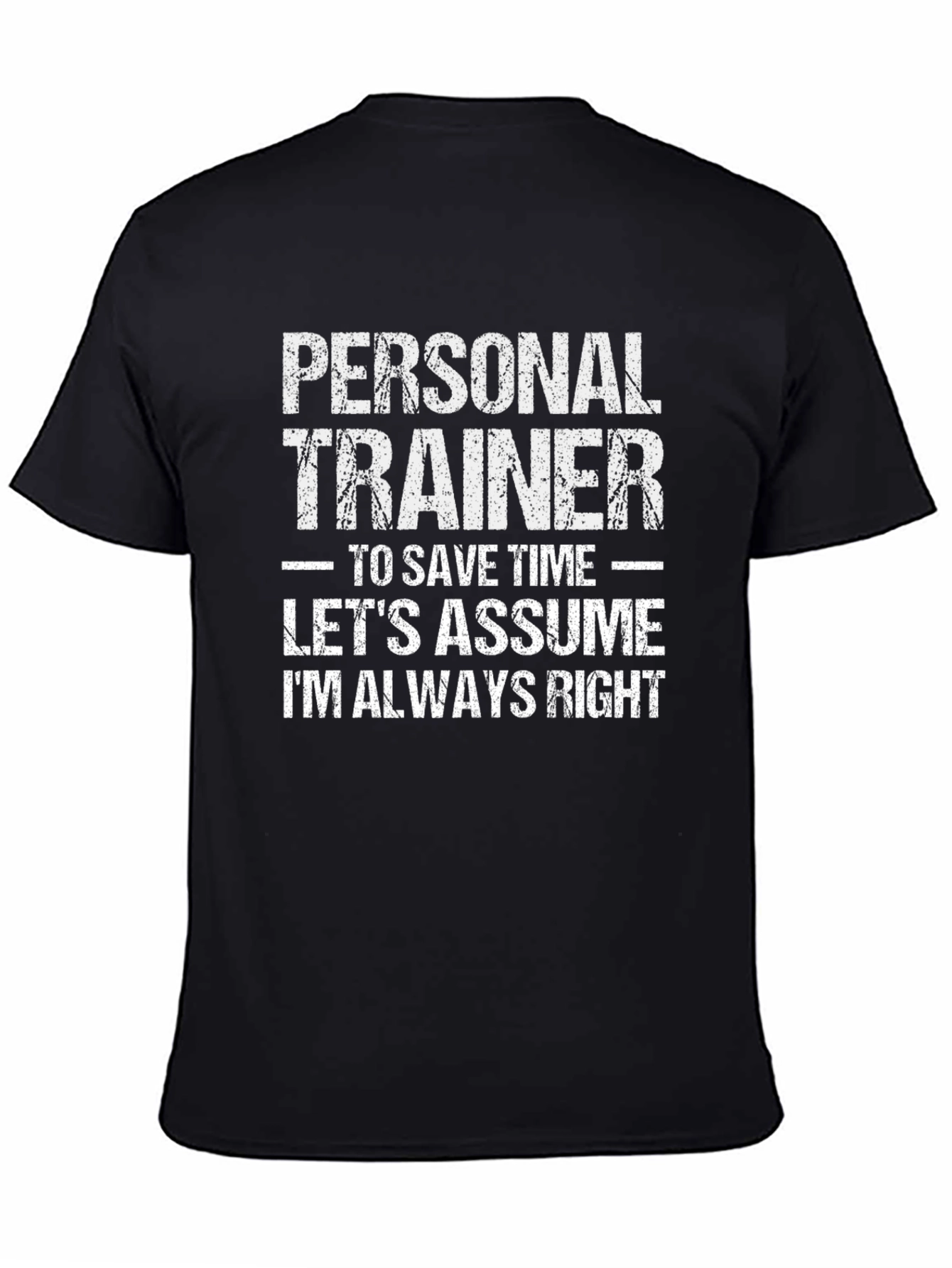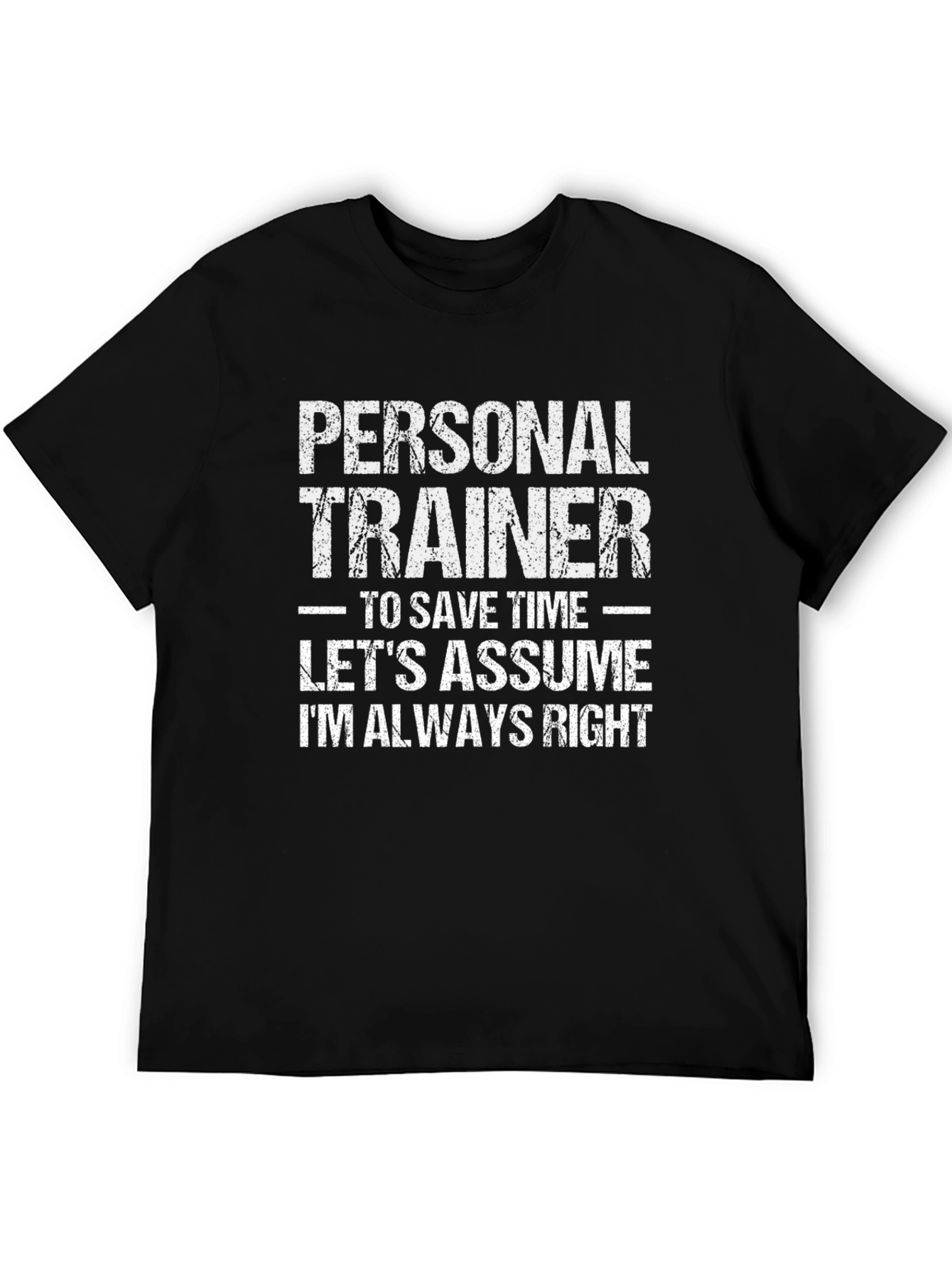 This black t-shirt features a bold, distressed white graphic that declares the wearer's profession and confidence. The graphic reads 'PERSONAL TRAINER' in large, stacked letters. Below, it says 'TO SAVE TIME - LET'S ASSUME I'M ALWAYS RIGHT' adding a humorous touch. Ideal for personal trainers who want to showcase their personality and expertise, this tee is perfect for gym sessions, casual outings, or even as a fun conversation starter. The classic fit and comfortable material make it a great addition to any wardrobe. Let everyone know you're the expert!