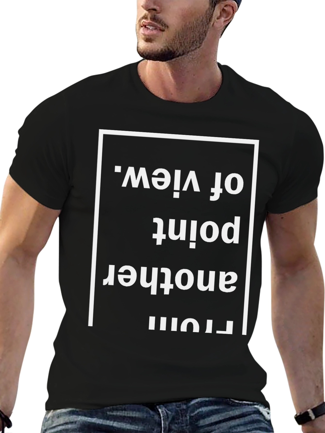 Embrace a fresh outlook with our Perspective Tee. This black t-shirt features a bold, eye-catching graphic with the phrase 'From another point of view' displayed within a clean, white rectangular border. The text design is vertically stacked, creating a unique and thought-provoking aesthetic. Made from a comfortable and durable fabric, this tee is perfect for everyday wear. Whether you're heading out with friends, exploring new ideas, or simply want to make a statement, this shirt is sure to spark conversation and inspire a different way of seeing the world. Let this graphic tee be a reminder to look at life from every angle.