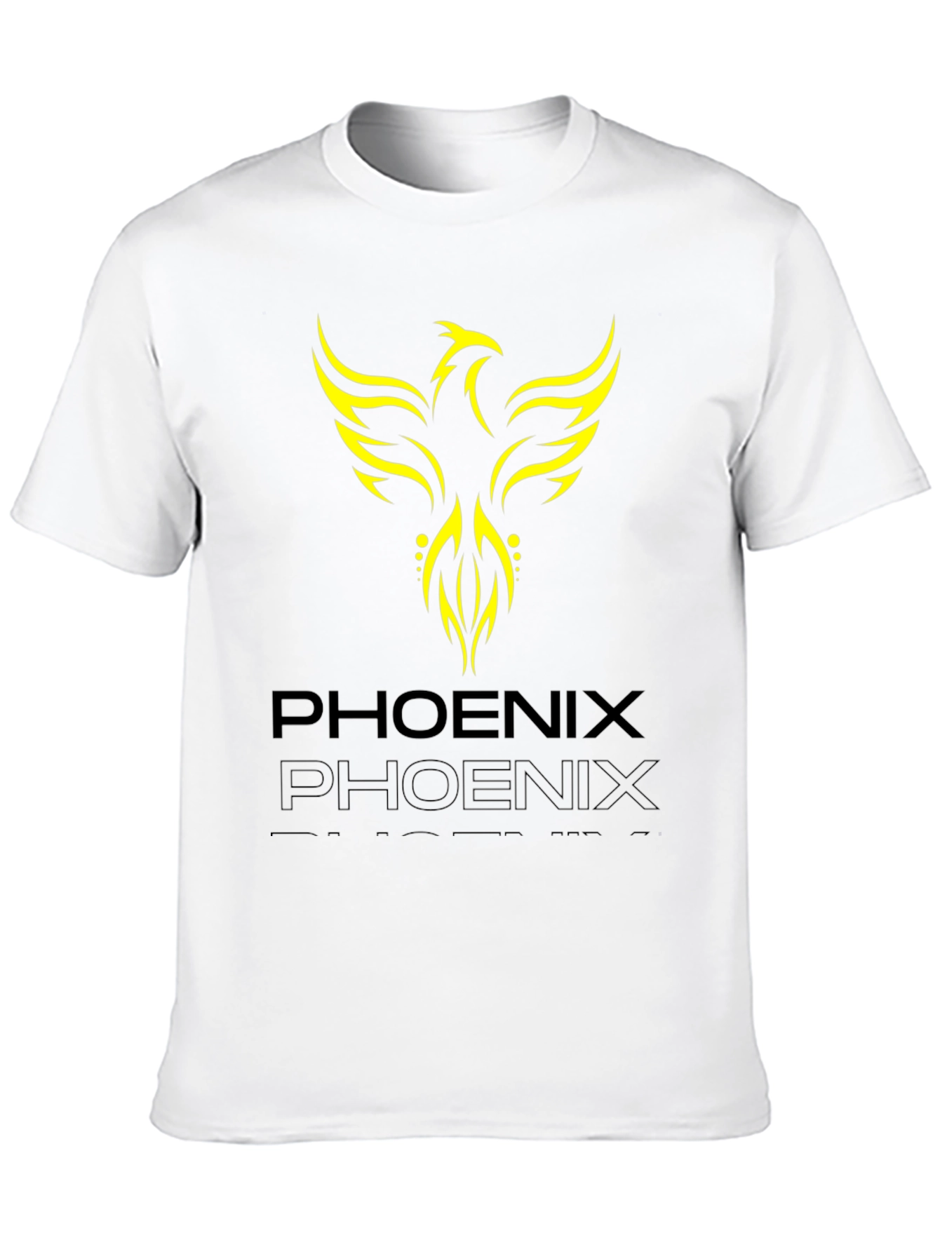 Make a bold statement with this eye-catching graphic tee. Featuring a striking yellow phoenix design emblazoned on a classic black cotton t-shirt, this piece is perfect for casual wear. The tee is soft and comfortable, suitable for everyday use. The design incorporates the word "Phoenix", repeated in a faded gray scale. The vibrant graphic adds a touch of edgy style to your wardrobe. Ideal for those who appreciate unique and expressive clothing. Wear it to concerts, casual outings, or simply as a standout piece in your everyday attire. Get yours today!