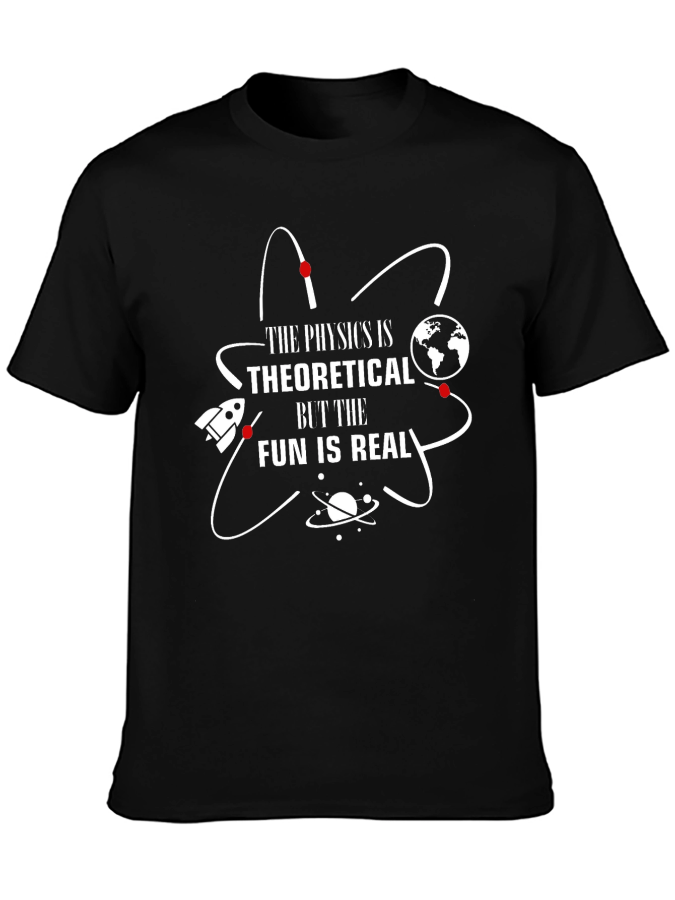 Show off your love for science with this eye-catching black t-shirt! Featuring a unique graphic of an atom model incorporating a rocket, Earth, and planet, alongside the humorous text "The Physics is Theoretical But the Fun is Real". Made from a comfortable fabric, this tee is perfect for casual wear, science enthusiasts, teachers, or anyone who appreciates a clever design. Makes a great conversation starter at school, science events, or just hanging out with friends. Get yours today and let everyone know that you're serious about fun!