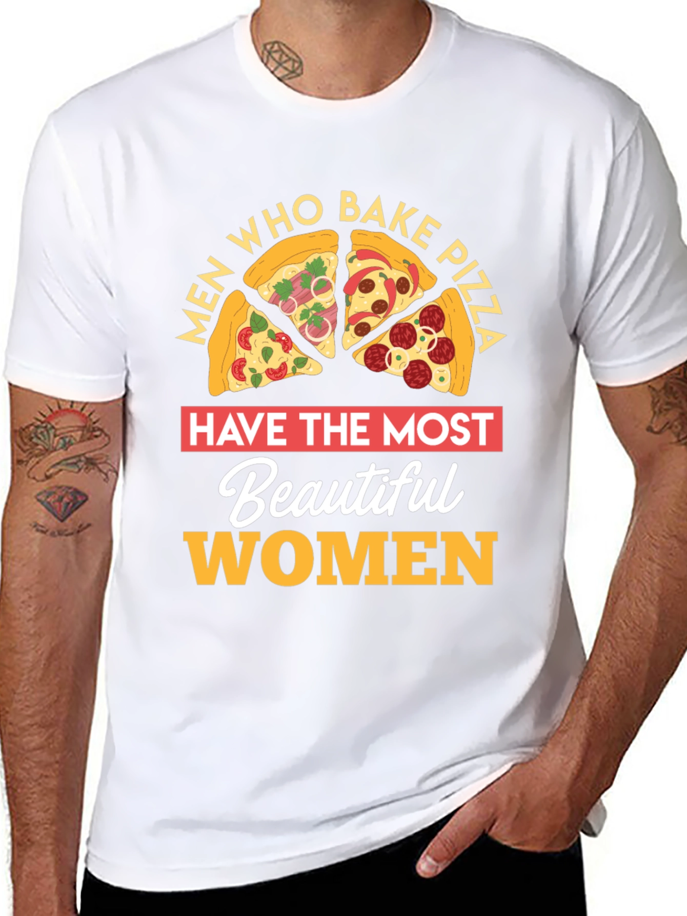 This eye-catching black t-shirt is perfect for pizza enthusiasts. It features a fun graphic design of pizza slices arranged to form a whole pizza. Above the pizza, the text reads 'MEN WHO BAKE PIZZA,' and below the pizza, the text 'HAVE THE MOST Beautiful WOMEN' in a bold, contrasting font. This tee is perfect for casual wear, pizza parties, or as a funny gift for the pizza lover in your life. Show off your passion for pizza with this unique and comfortable t-shirt.