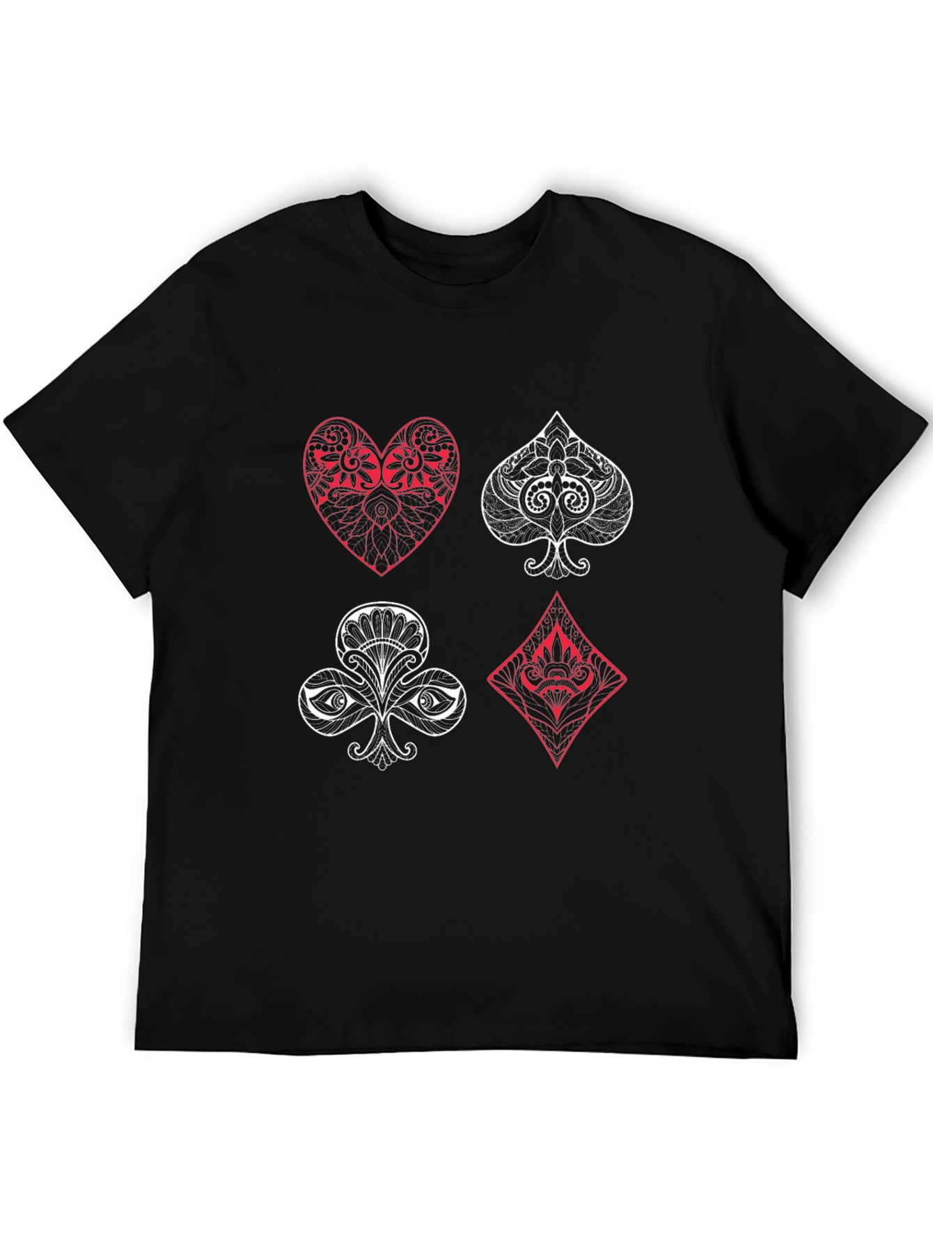 Show off your love for card games with this stylish black t-shirt! This tee features a unique graphic design of the four playing card suits: hearts, spades, clubs, and diamonds. The detailed, artistic rendering of each suit makes this shirt a standout piece. Made from a comfortable, breathable fabric, this t-shirt is perfect for casual wear. Whether you're heading to a game night, hanging out with friends, or just running errands, this shirt is a cool way to express your personality. Its versatile black color makes it easy to pair with jeans, shorts, or even dress it up with a jacket. A must-have for any card player or anyone who appreciates distinctive graphic tees!