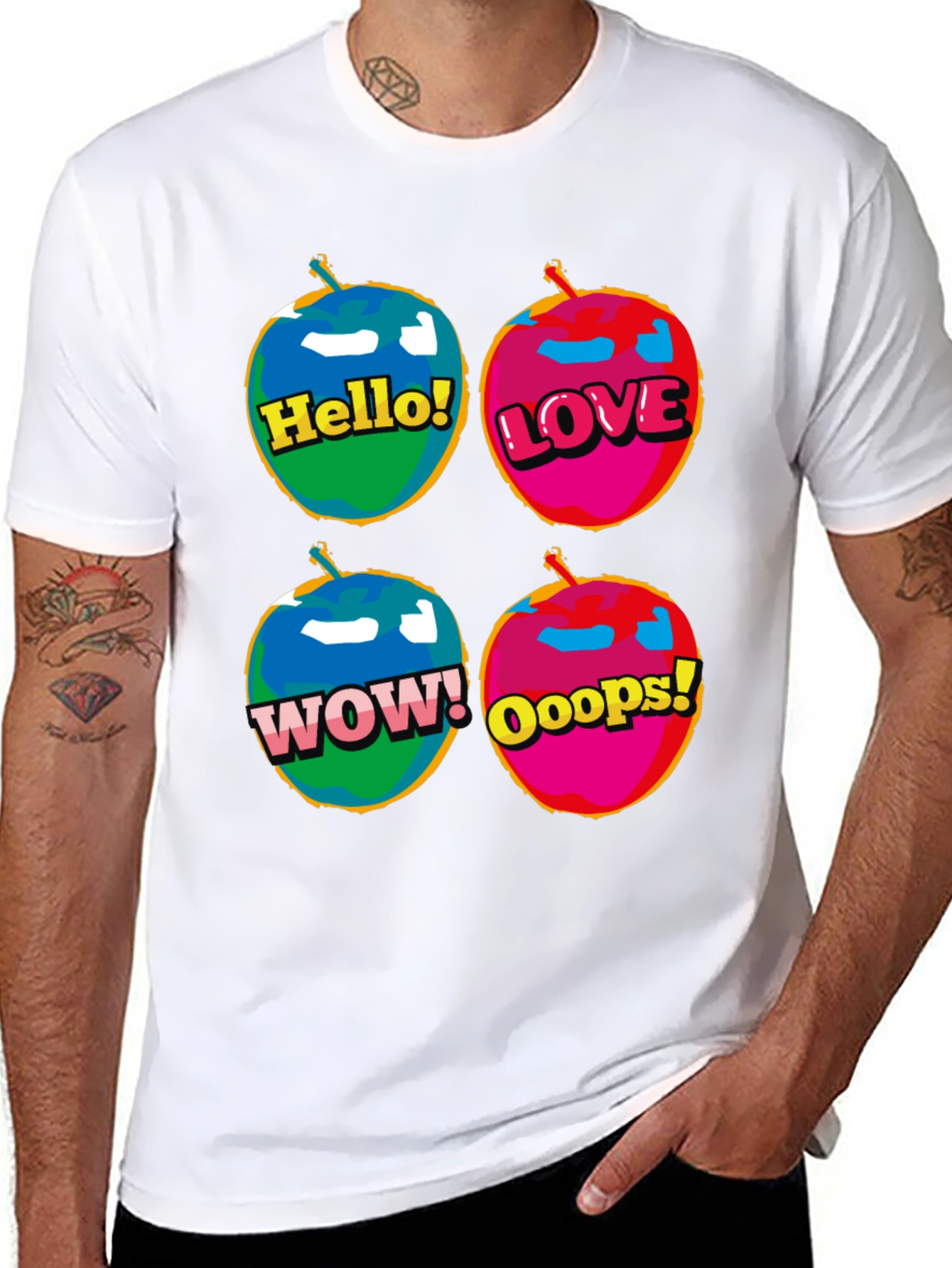 Make a statement with this bold, black t-shirt featuring a unique pop art design. The shirt showcases four vibrant apple-shaped emojis, each emblazoned with a playful message: "Hello!", "Love", "Wow!", and "Ooops!". The eye-catching colors and whimsical design will make you stand out in any crowd. Made from a comfortable fabric, this t-shirt is perfect for casual wear, expressing your fun-loving personality, or even as a conversation starter. The high-quality print ensures the design stays vivid wash after wash. Add a splash of color and positivity to your wardrobe with this must-have tee!
