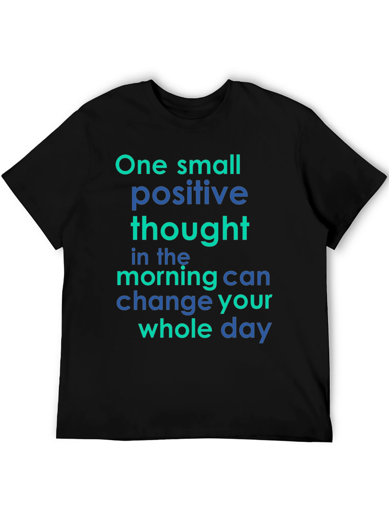 Elevate your mood with this inspiring black t-shirt. The vibrant blue and teal text reads, "One small positive thought in the morning can change your whole day," offering a daily dose of motivation. Crafted from a soft, comfortable fabric, this tee is perfect for everyday wear. The classic fit makes it a versatile addition to your wardrobe, easily paired with jeans or shorts. Spread positivity and make a statement with this unique graphic tee, ideal for casual outings, workouts, or simply lounging at home. Its uplifting message and comfortable design make it a must-have for anyone seeking a little extra encouragement in their day.