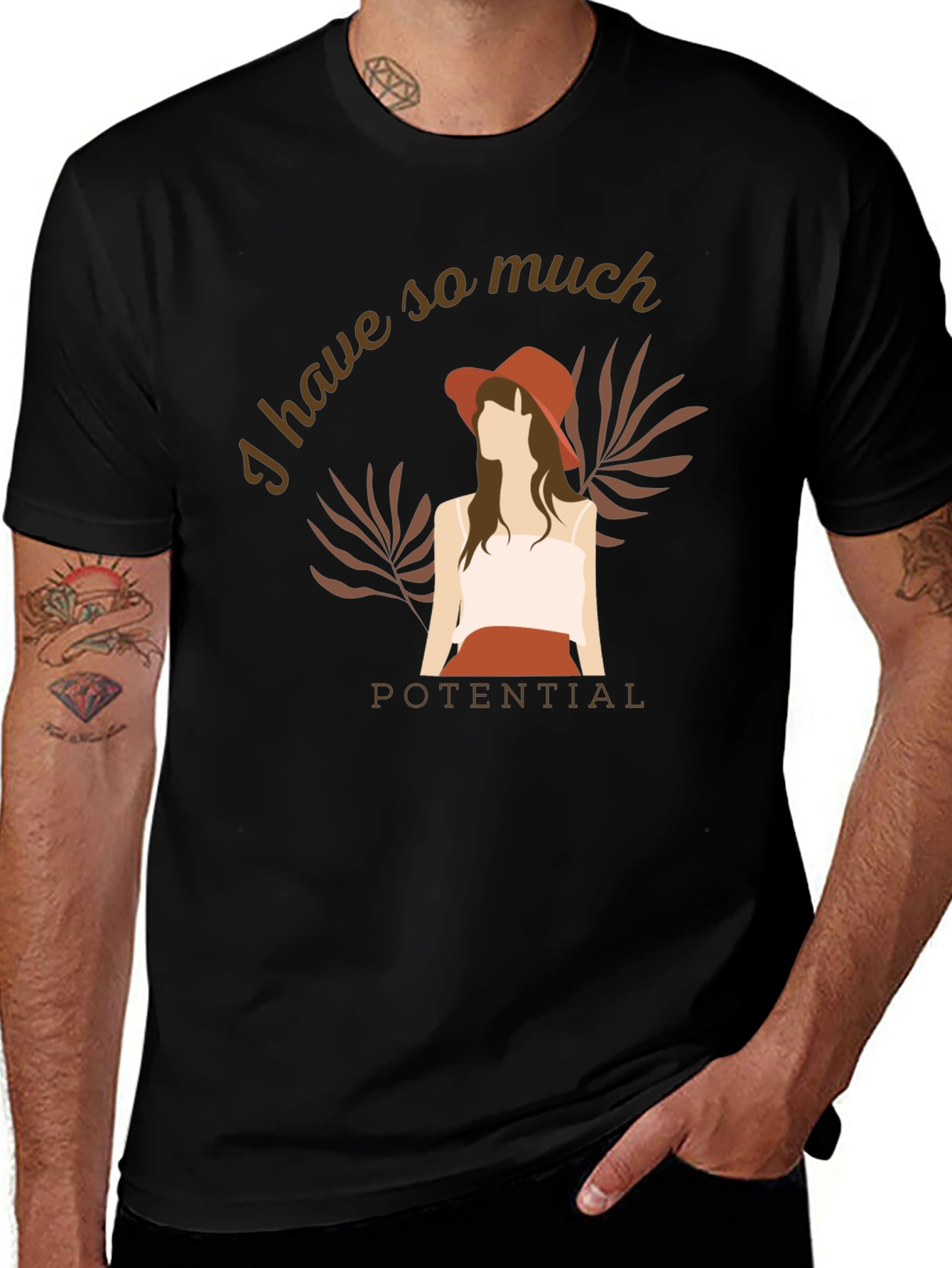This stylish black t-shirt features a chic and minimalist graphic design that says 'I have so much potential.' The design includes an illustration of a woman in a hat, paired with botanical elements, creating a trendy and sophisticated look. Perfect for casual wear, this tee can be dressed up or down. Made from a comfortable-looking fabric, it's ideal for everyday wear, whether you're running errands, meeting friends, or just relaxing at home. Show off your positive vibes with this unique and eye-catching t-shirt!