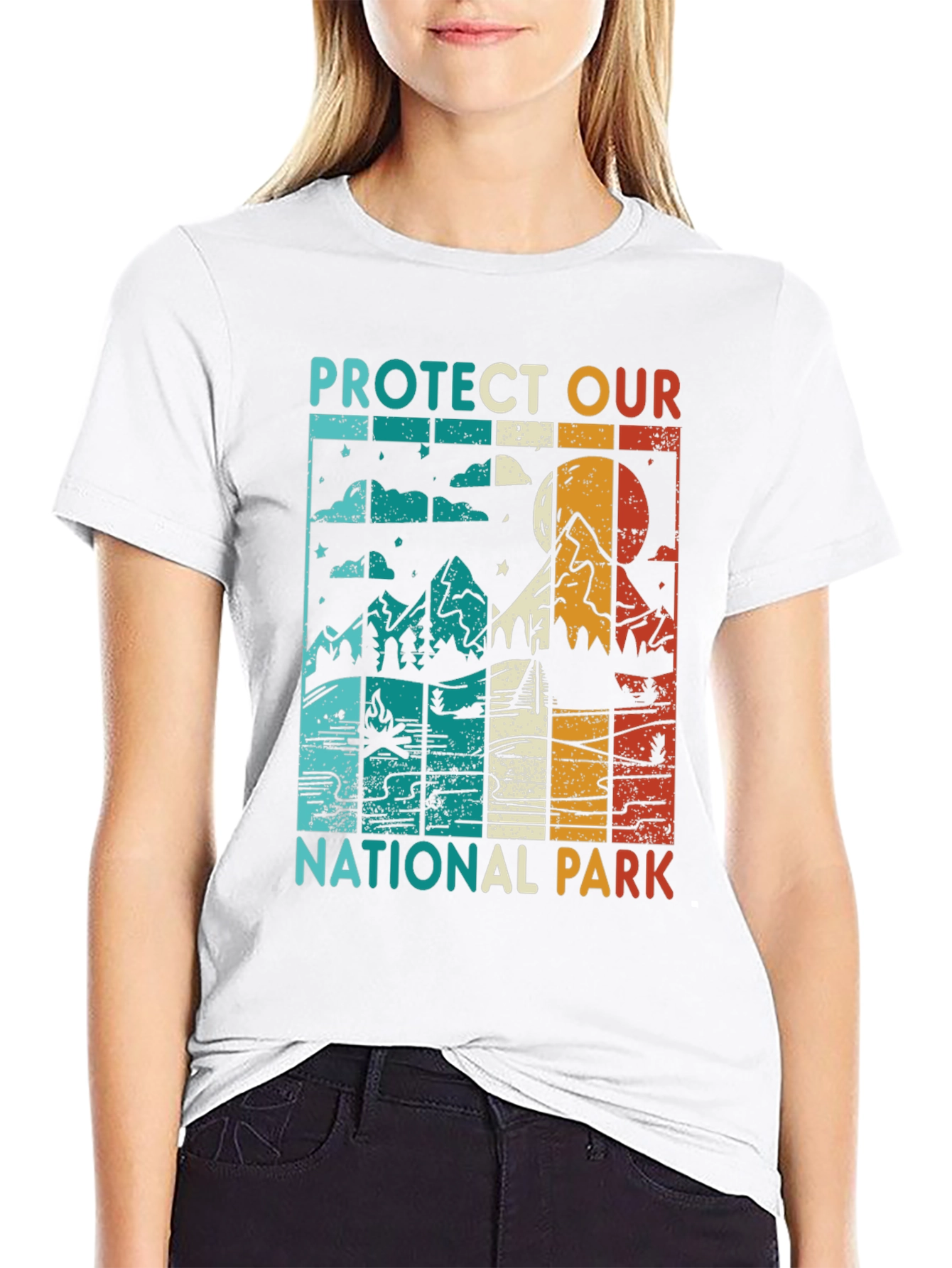Show your love for nature with this stylish black t-shirt. It features a unique, retro-inspired graphic design divided into colorful squares depicting various aspects of a national park. This includes mountains, trees, a campfire, and a full moon against a vintage color palette. The phrase 'PROTECT OUR NATIONAL PARK' is printed above and below the graphic. Made from a comfortable, breathable fabric, this tee is perfect for casual wear, outdoor adventures, or as a statement piece to promote conservation. A must-have for nature enthusiasts and environmentally conscious individuals alike.