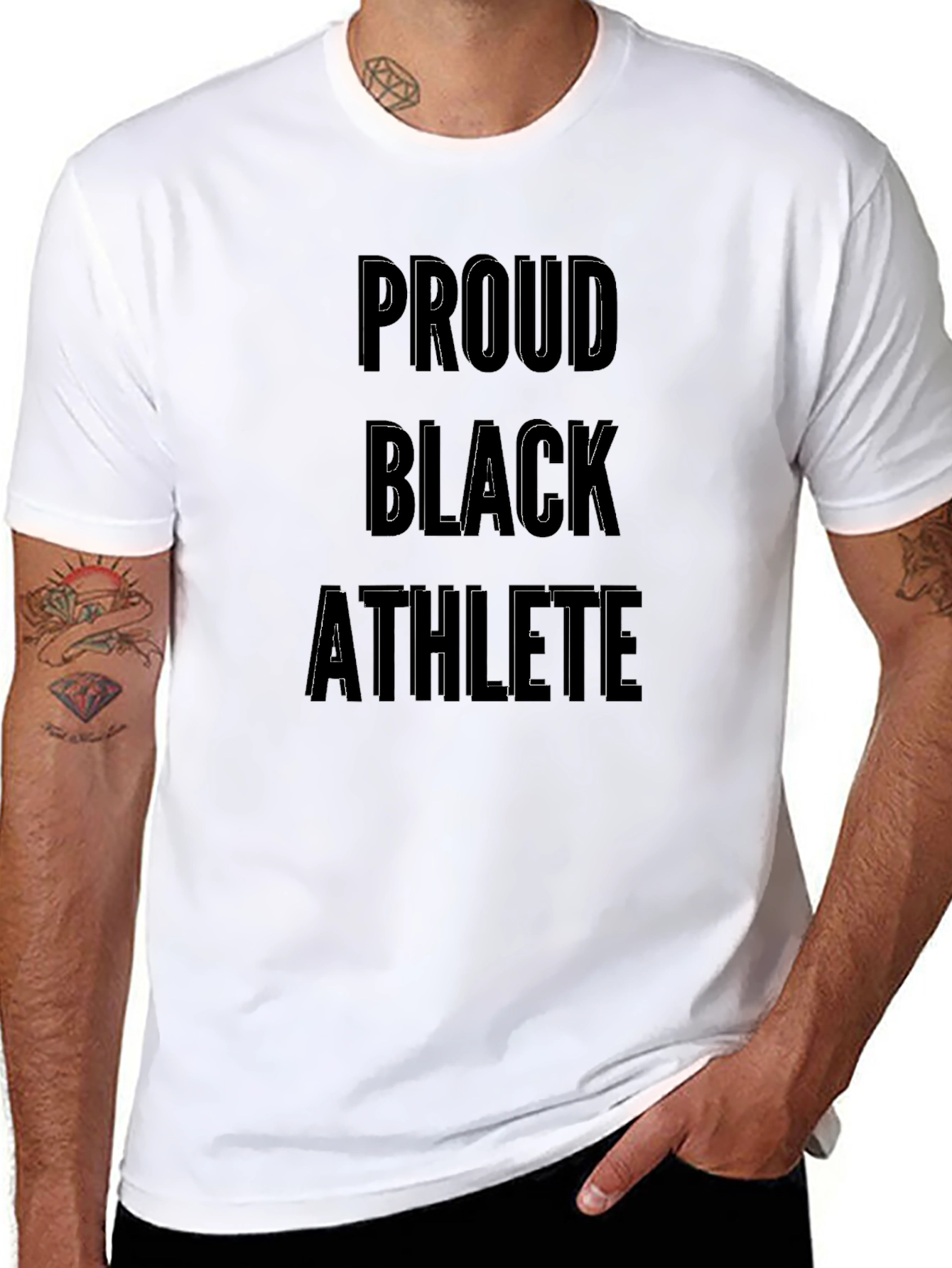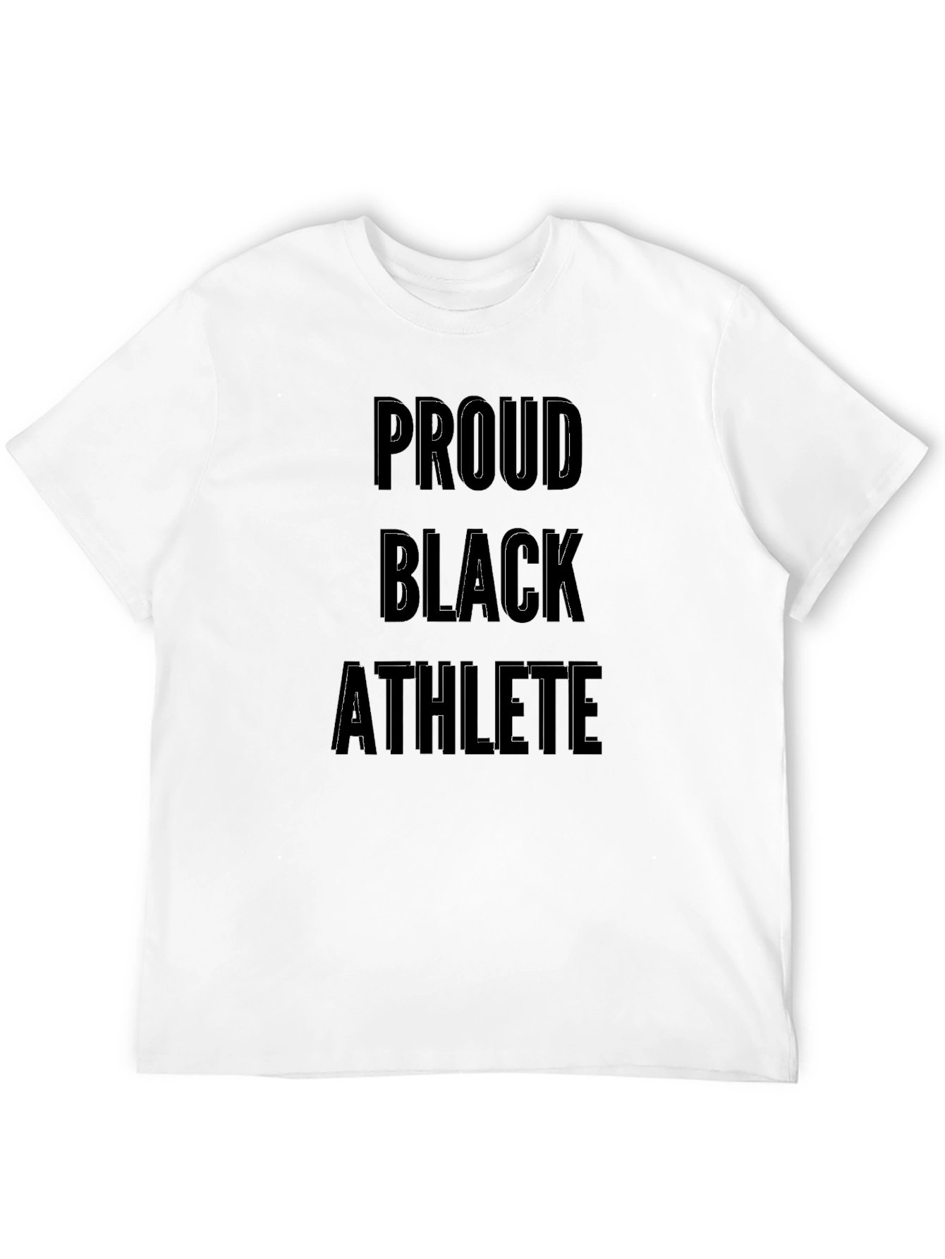 Show your pride with this striking black t-shirt. The bold message "Proud Black Athlete" is emblazoned across the chest in a strong, outlined font, making a powerful statement. This classic tee features a comfortable fit, short sleeves, and a crew neck, perfect for everyday wear or athletic activities. The dark color provides a sleek, stylish look that pairs well with any outfit. Whether you're hitting the gym, attending a game, or just hanging out, this t-shirt lets you express your identity with confidence and style. Made with quality materials for lasting comfort and durability.