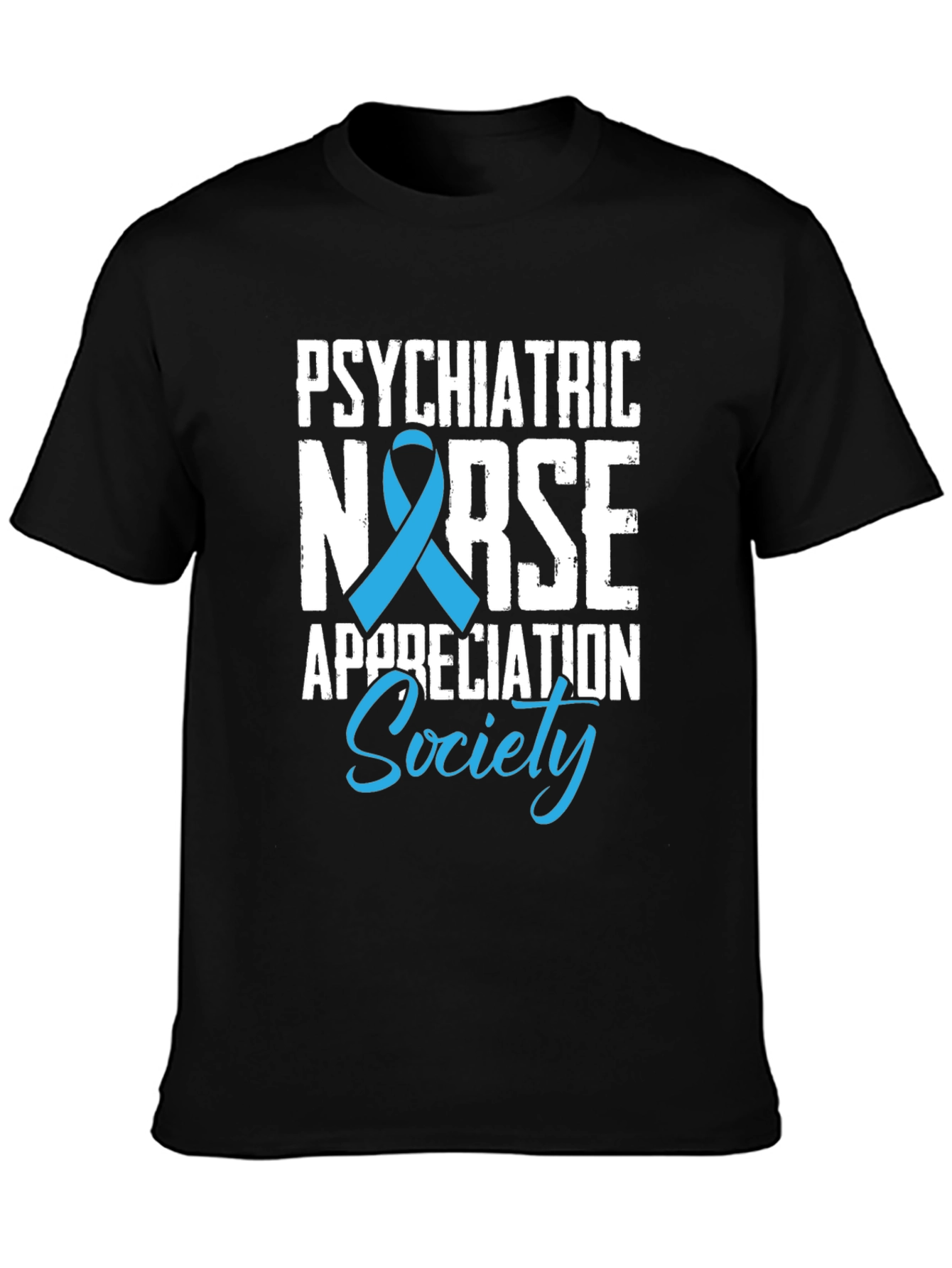 Show your support with this Psychiatric Nurse Appreciation Society T-shirt. This black tee features a bold graphic design with distressed white lettering for 'Psychiatric', 'Nurse', and 'Appreciation', complemented by a blue ribbon. 'Society' is scripted in a cursive blue font, completing the eye-catching design. Made from a comfortable fabric blend, this shirt is ideal for casual wear, supporting a great cause, or showing appreciation for psychiatric nurses. Perfect for nurses, their supporters, or anyone raising awareness.