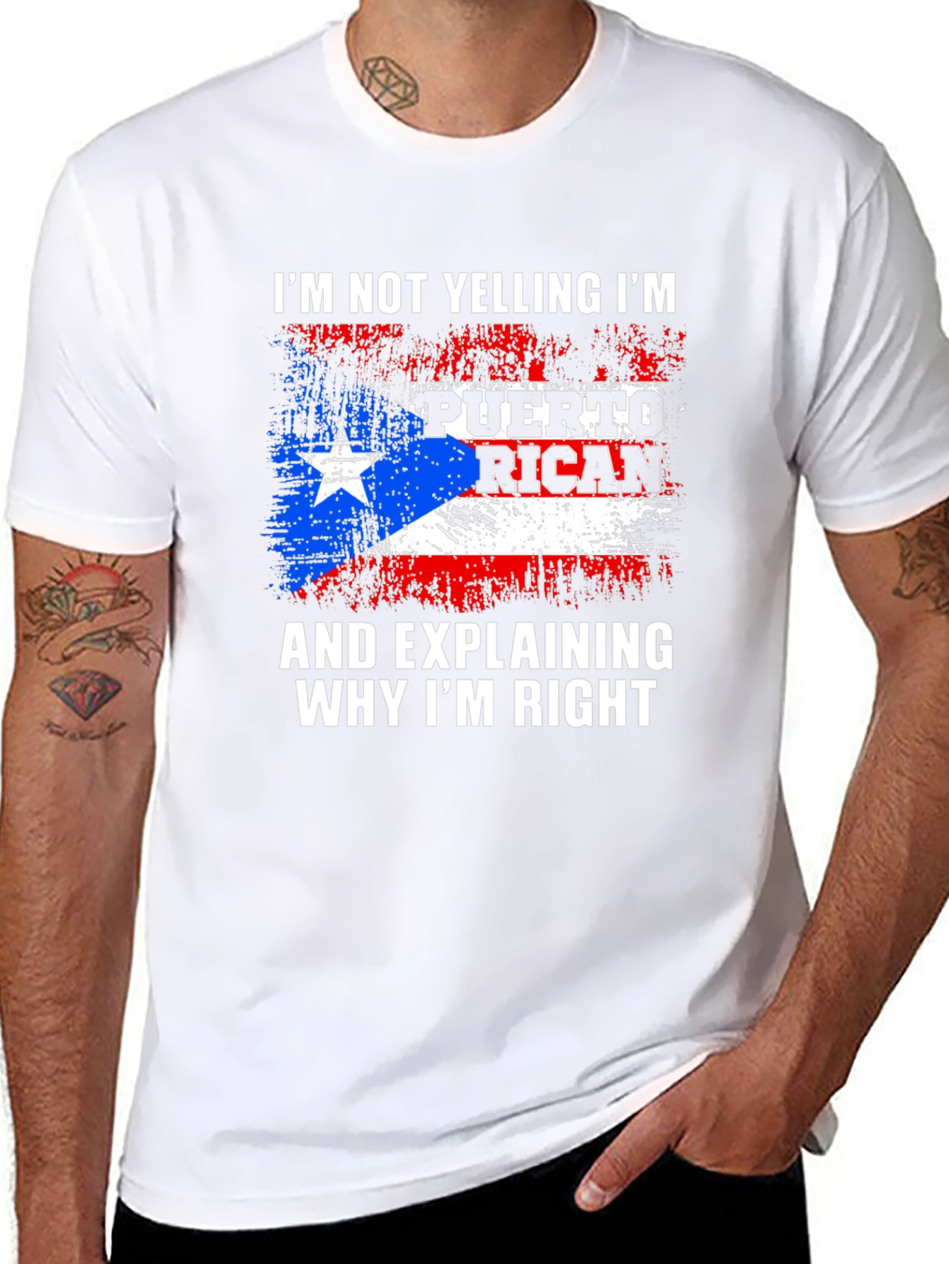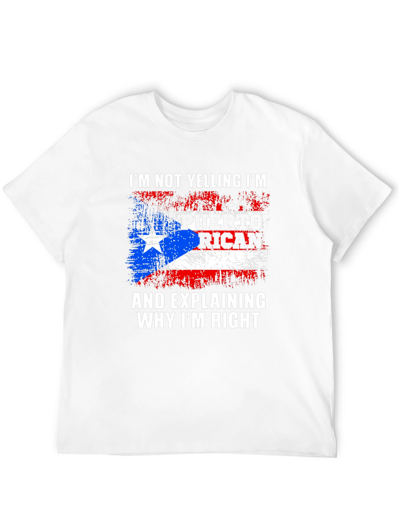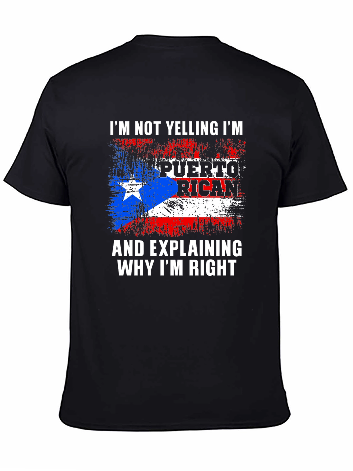 Show off your Puerto Rican pride with this bold graphic tee! This black t-shirt features a distressed Puerto Rican flag design emblazoned with the humorous saying, "I'm Not Yelling I'm Puerto Rican And Explaining Why I'm Right." The design incorporates the iconic red, white, and blue of the flag. Made from a comfortable-looking fabric, this short-sleeve tee is perfect for casual wear. Great for everyday wear, family gatherings, cultural events, or as a gift for the proud Puerto Rican in your life. Let your heritage shine with this unique and expressive t-shirt!