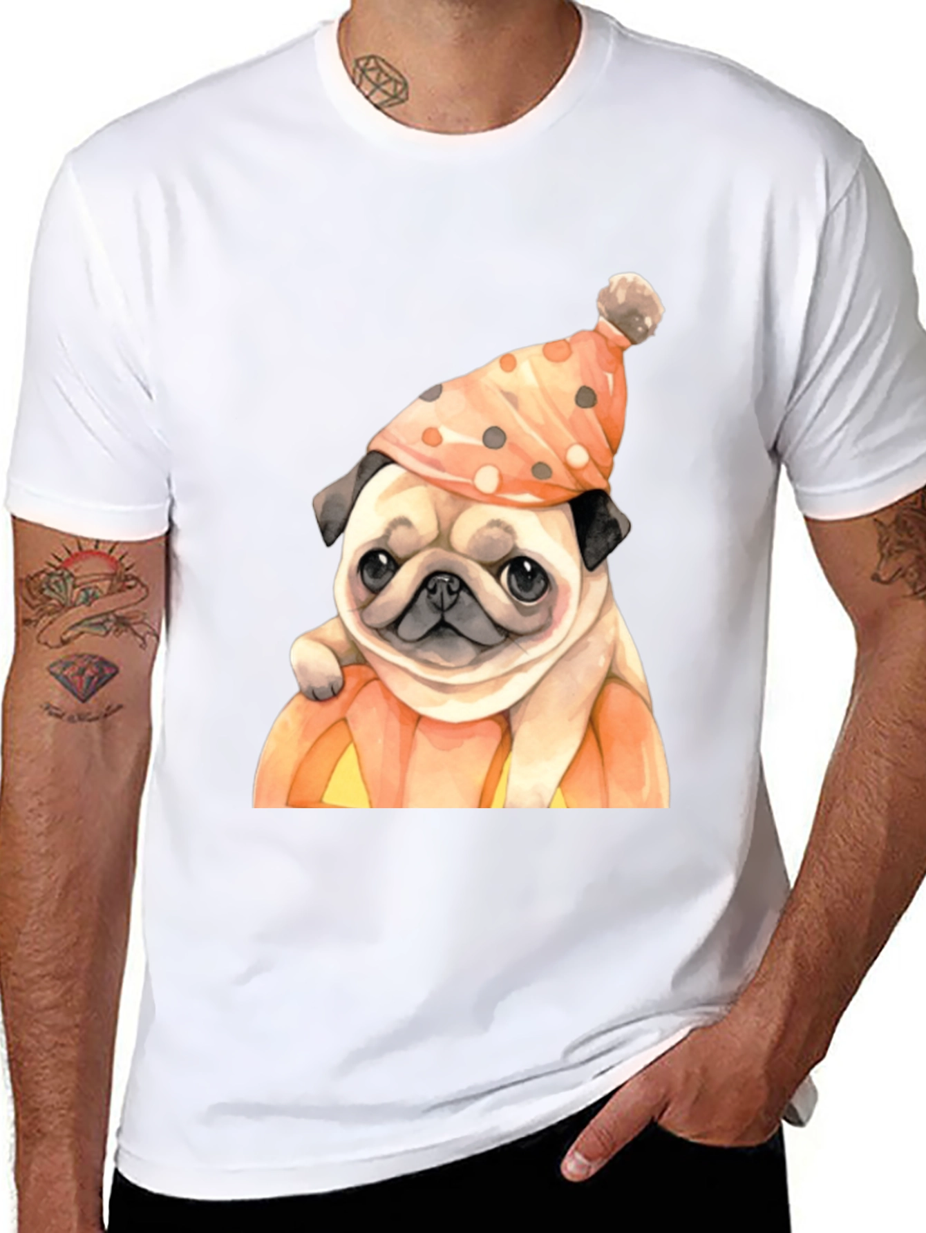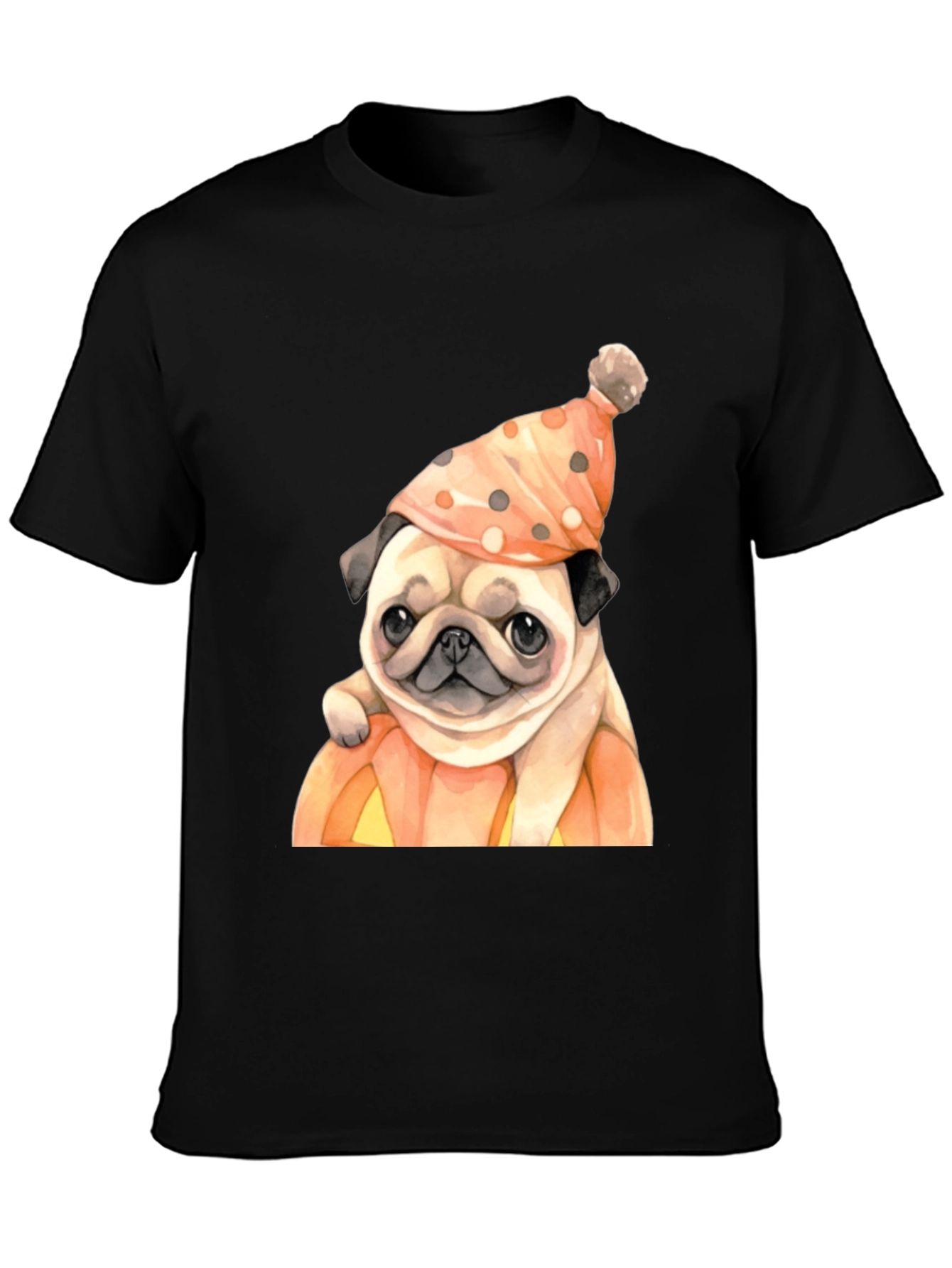 Get ready for Halloween with this adorable t-shirt featuring a charming pug perched inside a pumpkin. The pug is sporting a festive party hat with polka dots, adding a playful touch to the design. This comfortable black tee is perfect for casual wear during the spooky season. The vibrant graphic print stands out against the dark background, making it a fun conversation starter. Made from soft, breathable fabric, this t-shirt ensures all-day comfort. Whether you're attending a Halloween party, trick-or-treating, or just showing off your love for pugs, this t-shirt is a must-have addition to your wardrobe. Available in various sizes.