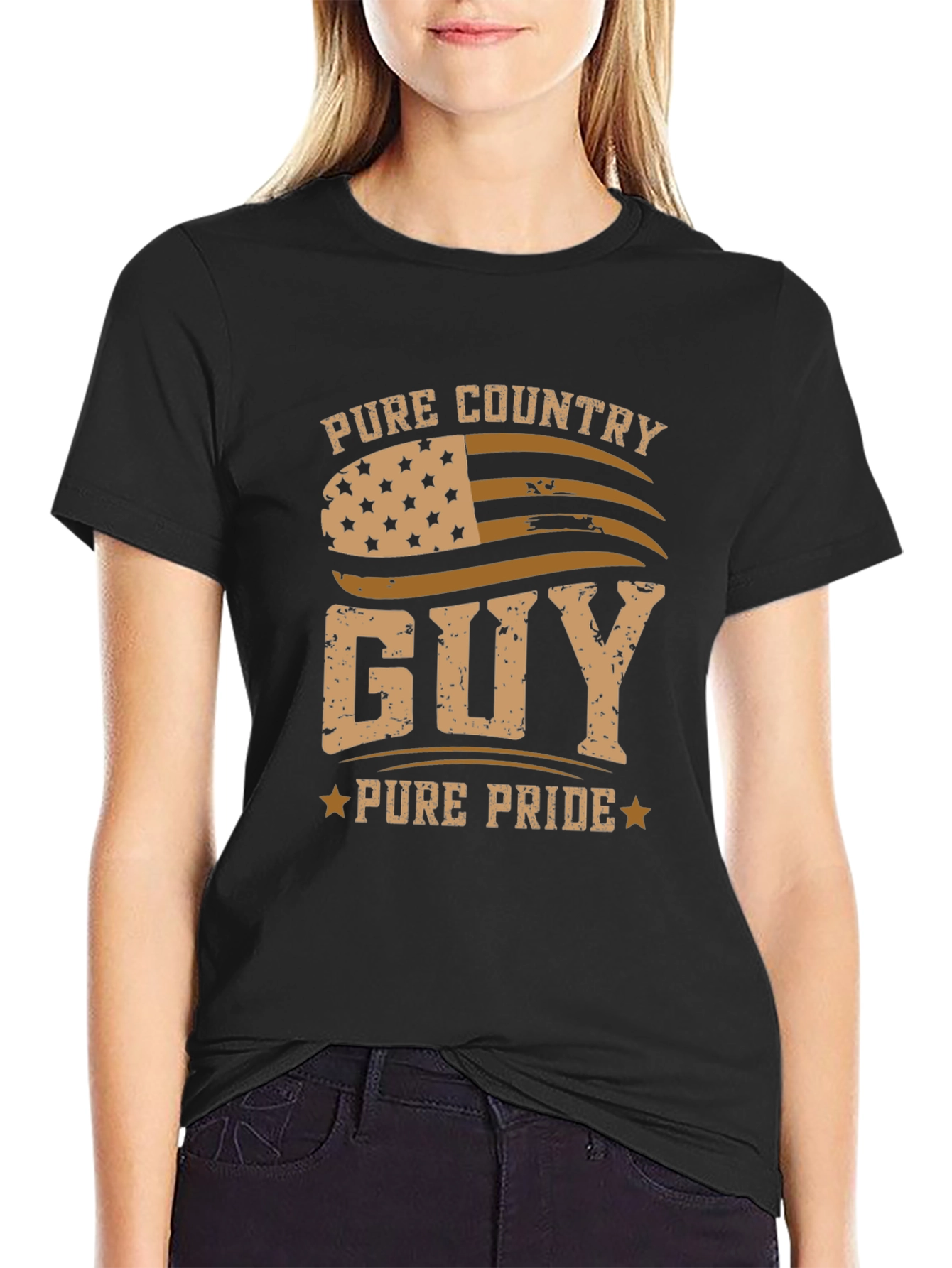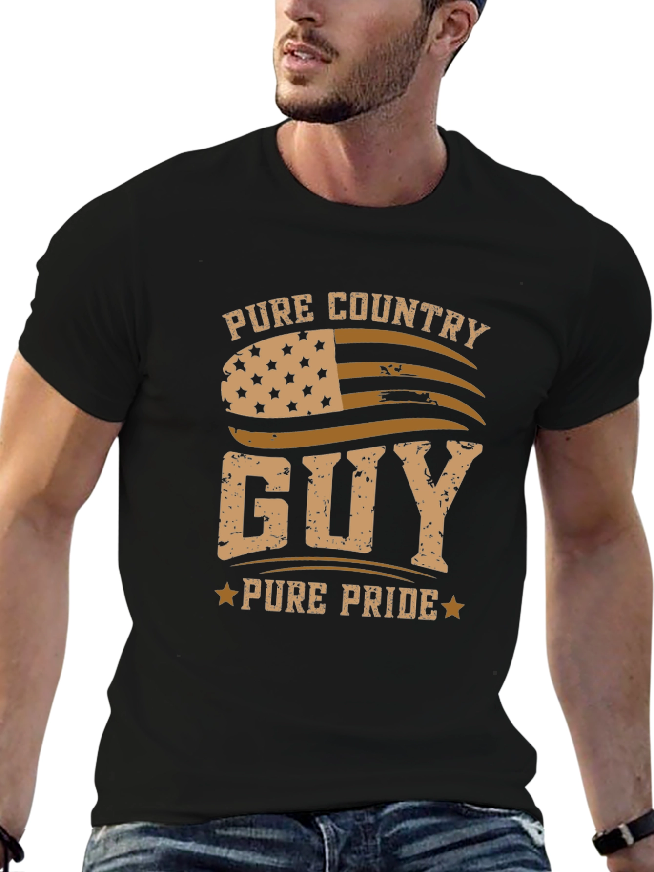Show off your country pride with this stylish black t-shirt! The design features a distressed American flag graphic with the words "Pure Country Guy" and "Pure Pride" in a rugged, vintage font. Made from a comfortable fabric blend, this short-sleeved tee is perfect for casual wear. The patriotic design makes it ideal for holidays, outdoor events, or everyday wear for the proud country enthusiast. Pair it with jeans or shorts for a relaxed yet spirited look. A must-have for anyone who loves country living and showing their American pride!